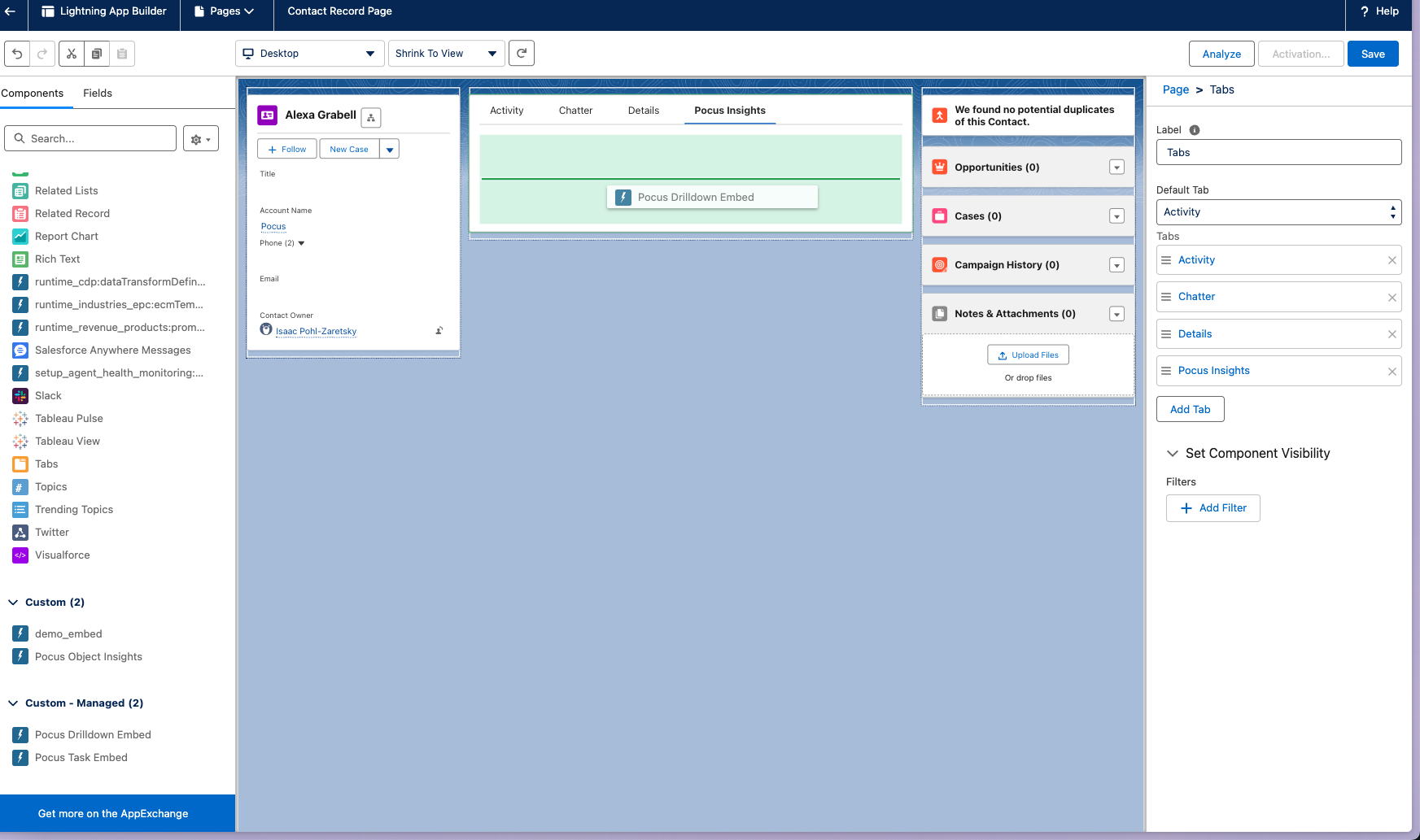 - From the component sidebar on the left side of the screen, drag the "Pocus Object Insights" component into the desired section of the record page.