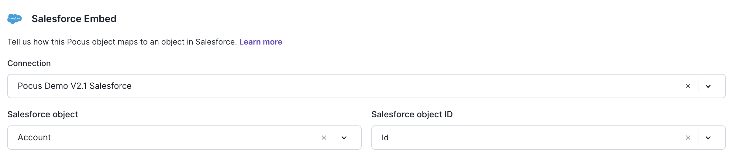 - If your workspace is connected to SFDC, you'll see a Salesforce Embed configuration form at the bottom of the Settings page. Here you will select the Salesforce object from a list of available objects (e.g., Account, Contact, Custom_object__c). Then select field available in Pocus that maps to the Salesforce object record id (e.g., Salesforce Account Id).