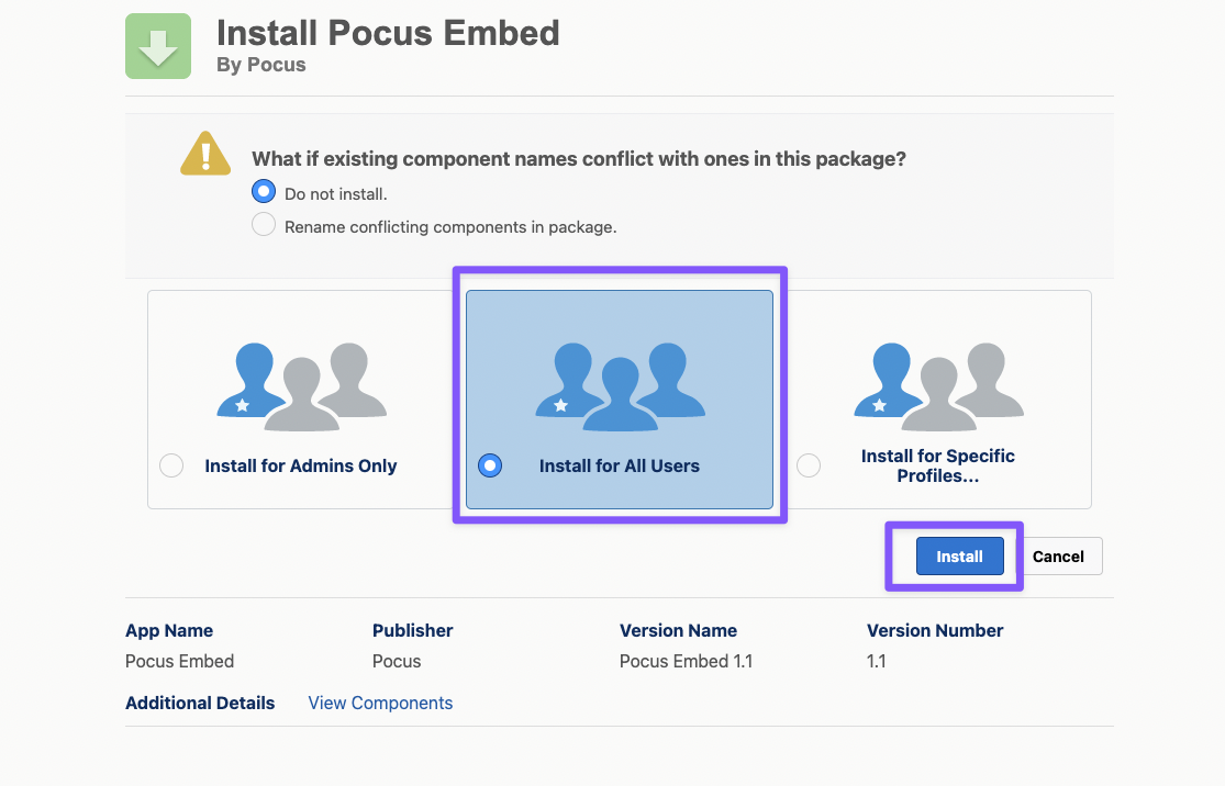 - Install the Pocus embed package to Salesforce, and make sure to select "Install for All Users" when prompted.