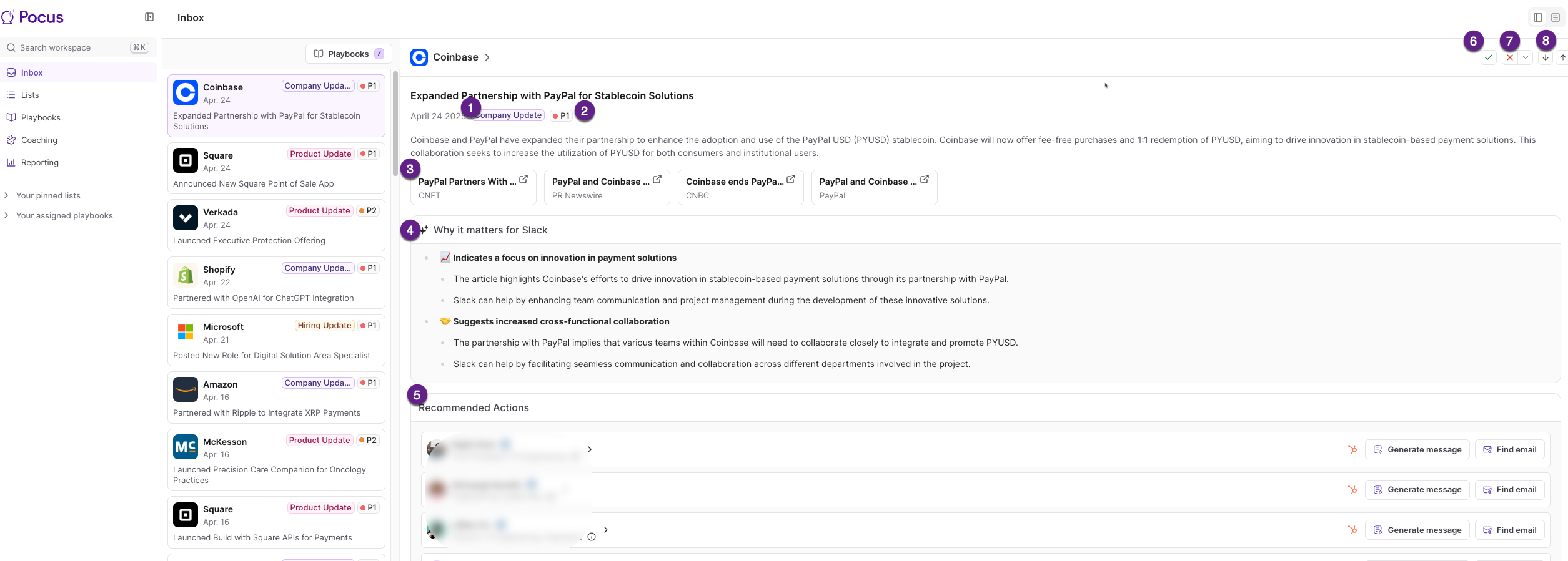 Recommended Actions: Review a list of suggested best contacts and take action right from the alert! You can use Find Email to lookup the contacts email address, Generate Message to leverage our AI Email Generator to craft the perfect messaging, or even customize actions, such as Enroll In Hubspot Sequence