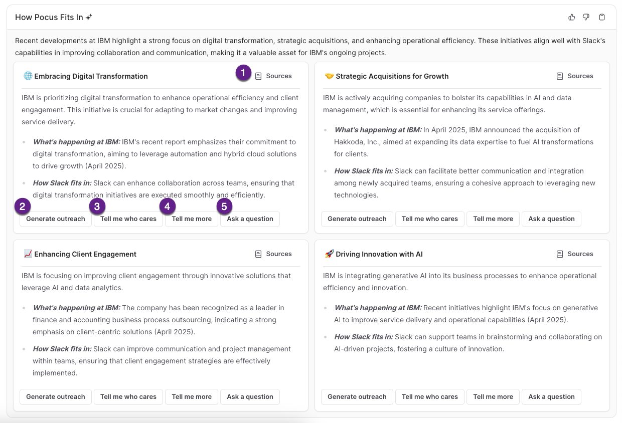 This section provides insights on how your company can fit into various initiatives and news events found for the account. Each card will detail a recent event or initiative for the account, as well as how your company can potentially serve them in this area.
