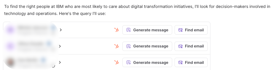 Once you've identified the best individual to outreach, you can use Find Emailto lookup their email address, select Generate Message to utilize our AI Email Generator to craft the perfect message or call script, as well as configure actions such as Enroll in Hubspot Sequence.