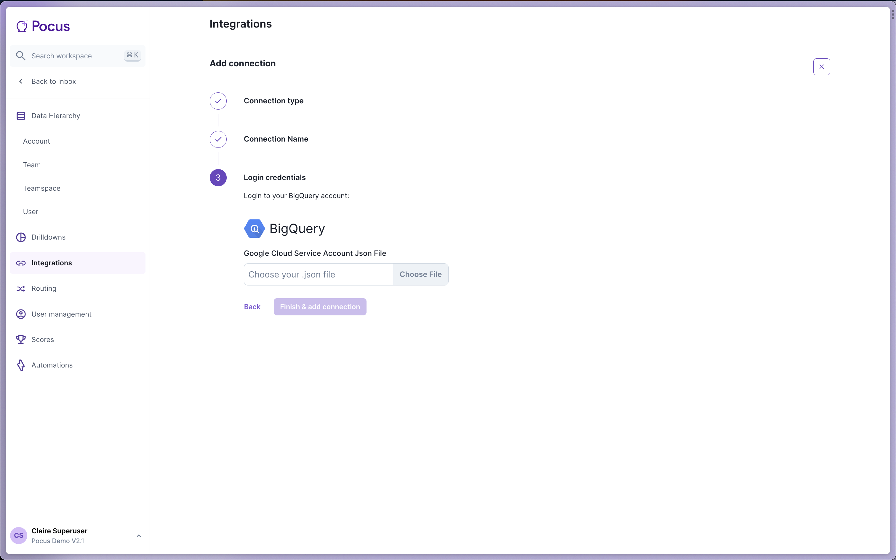 - Click Choose file and select the service account file we generated in the last section. Then, press Finish & add connection