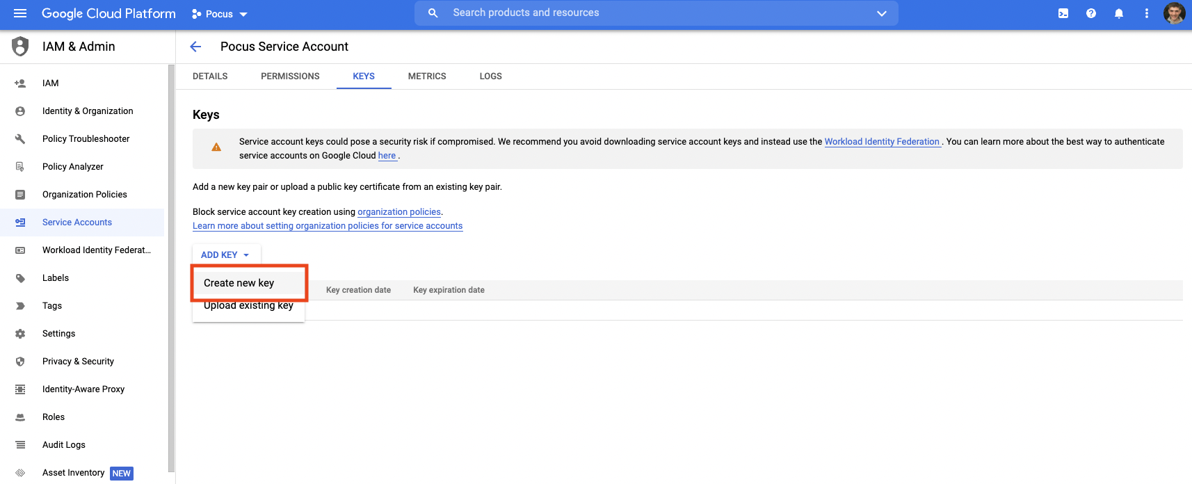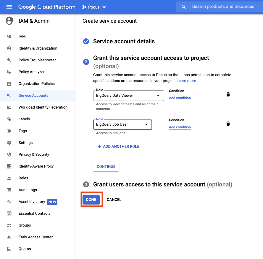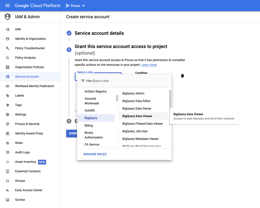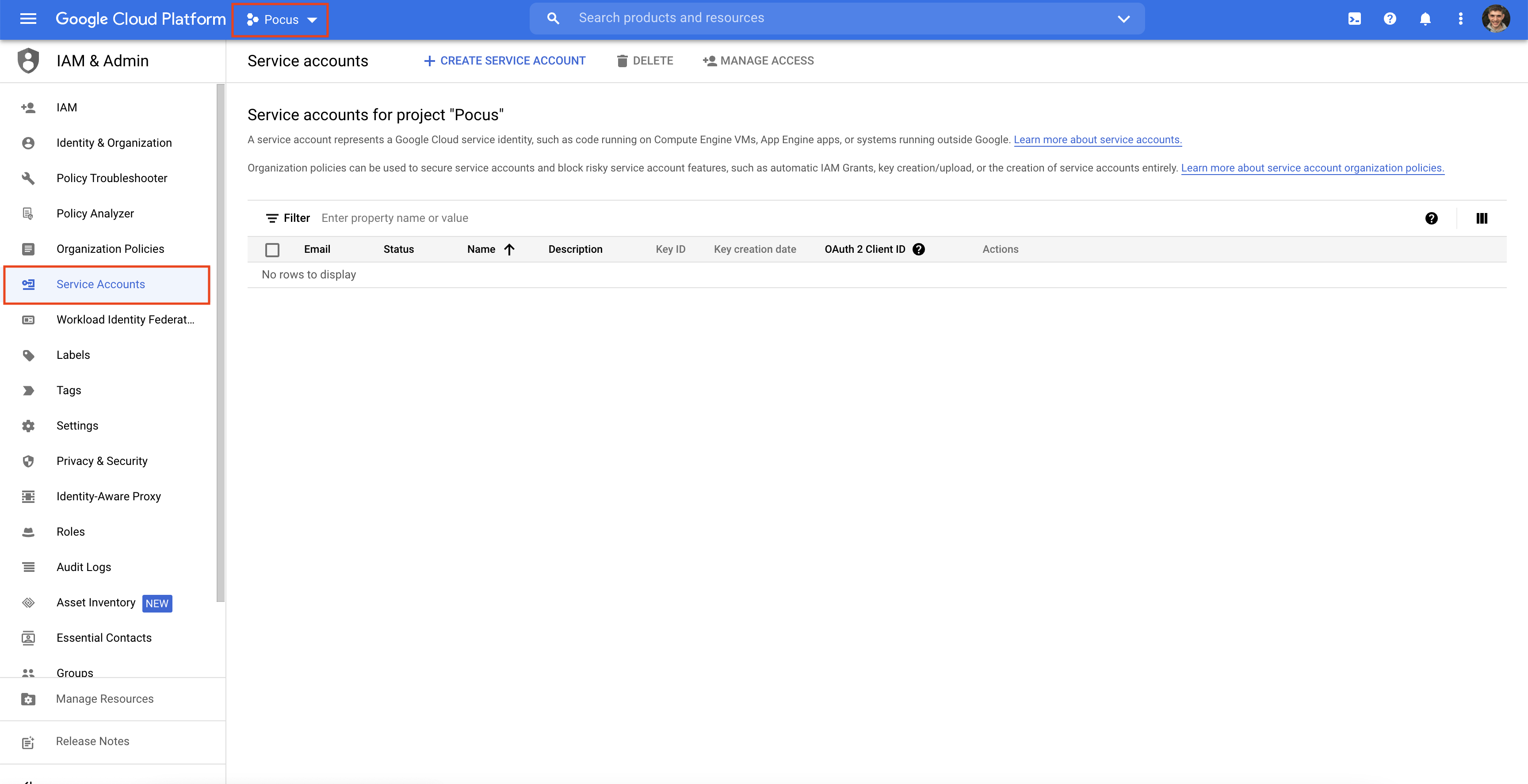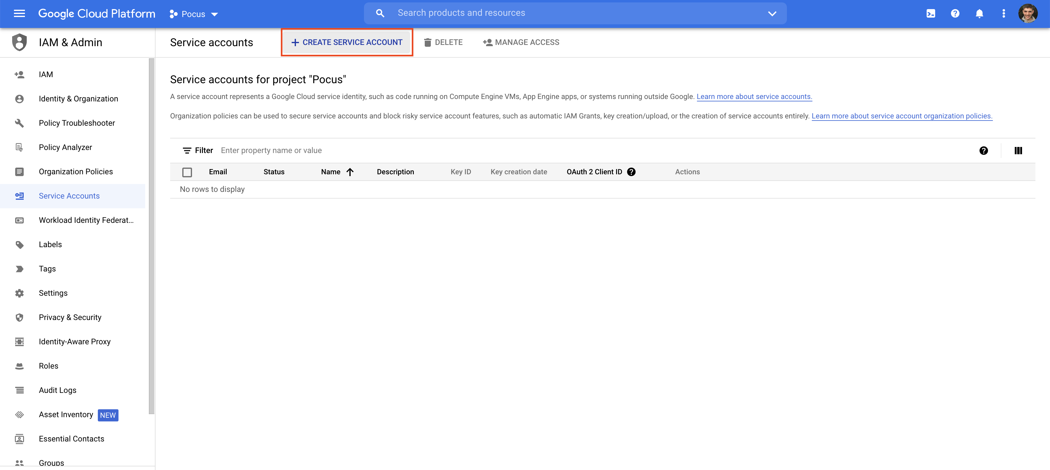 Pocus uses a Google Cloud service account to authenticate with BigQuery. This section will explain how to create such an account. You must have admin permissions on Google Cloud in order to create a service account.