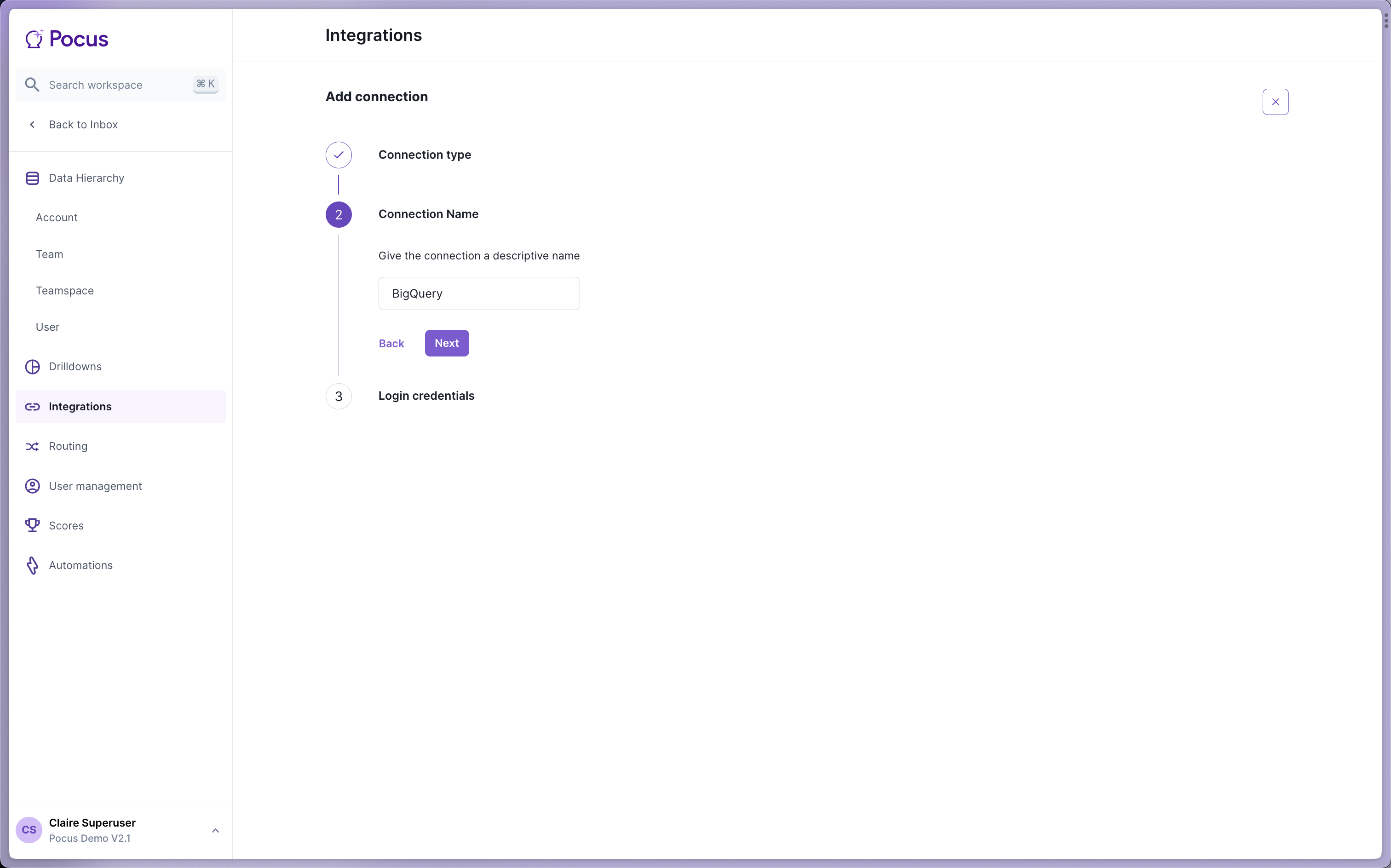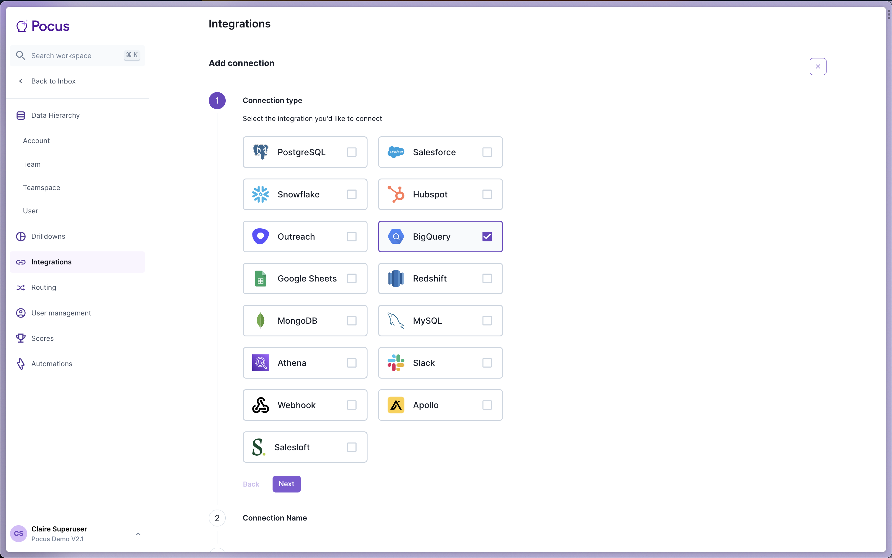 - Navigate to the Pocus Integrations Page and press Add a Connection