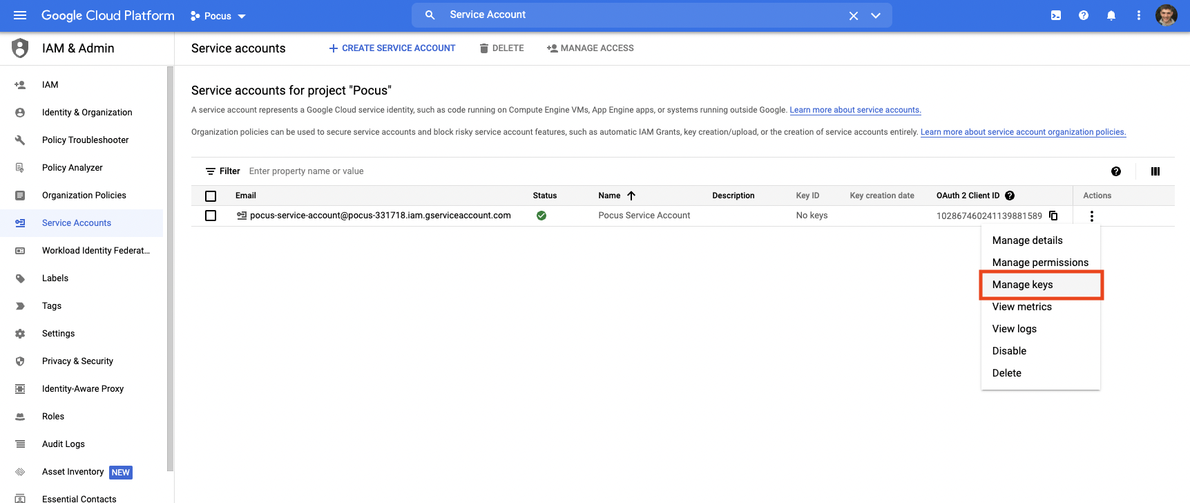 - From the Service accounts page, click on the actions dropdown for the newly created service account, and press "Manage keys"