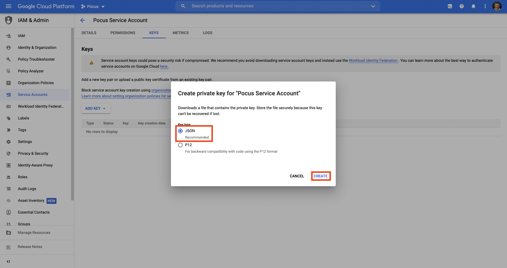 - Ensure JSON is selected, and press Create. A file will be downloaded to your computer, which you will need in the next section.