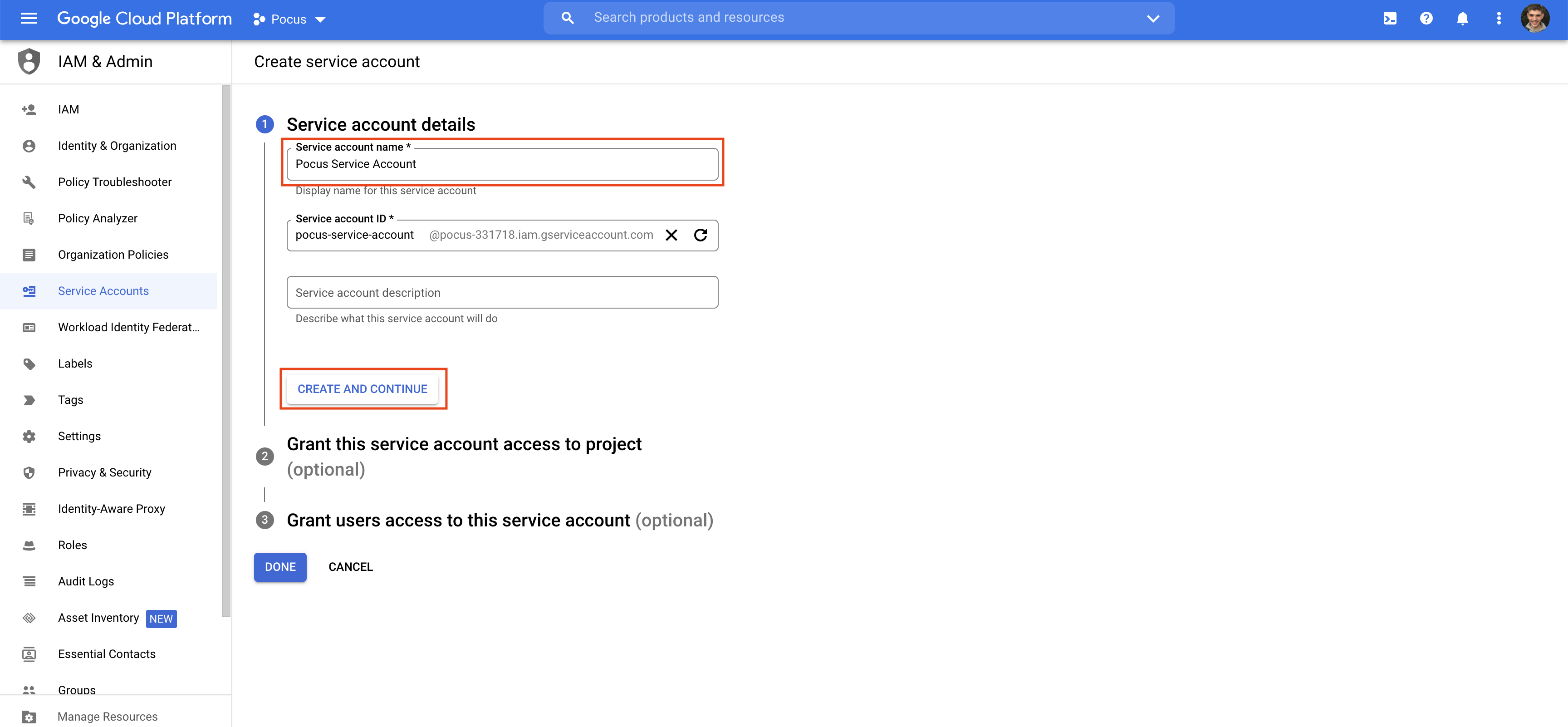 - Enter a name for the Pocus service account, optionally add a description, click the Create and Continue button.