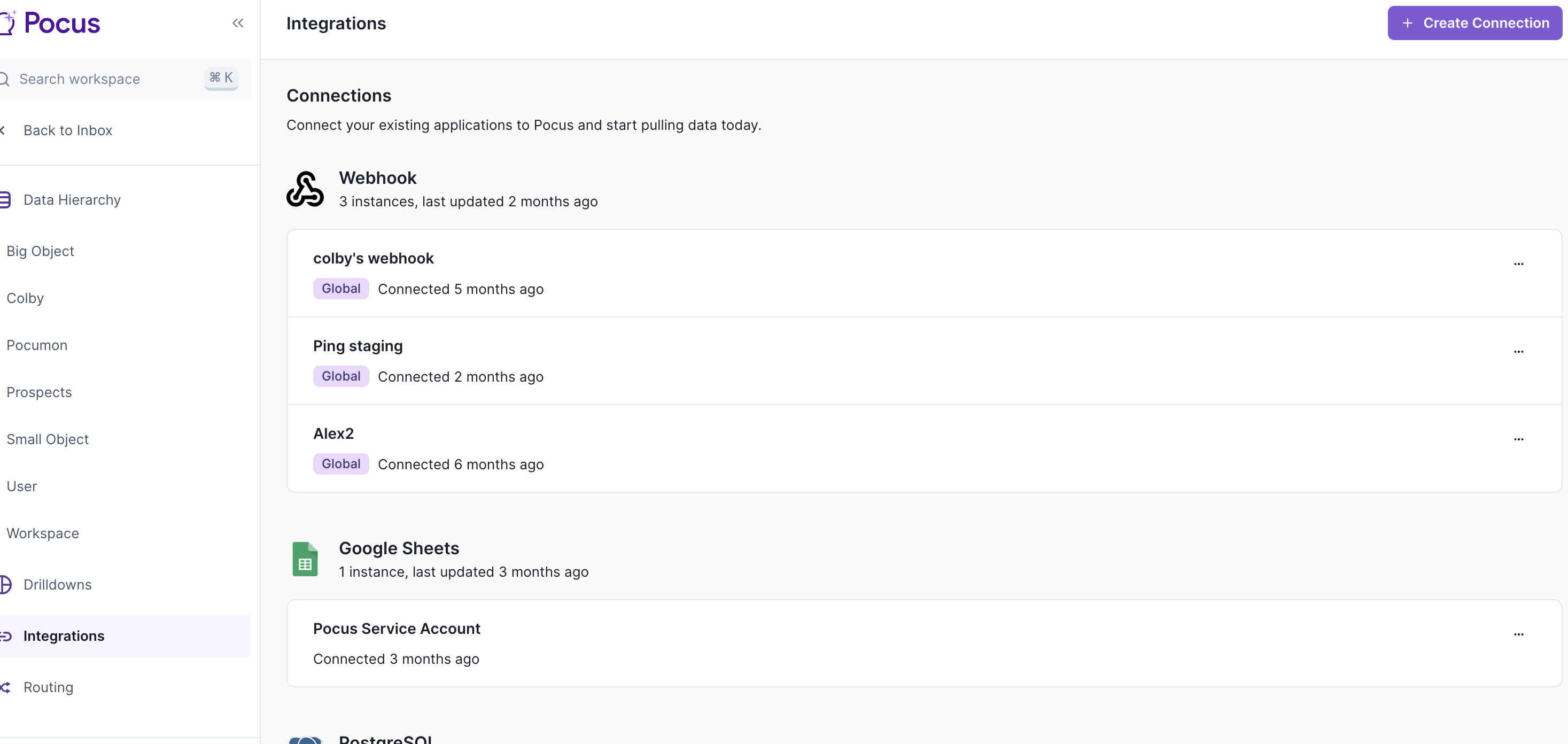 - Navigate to the Pocus Integrations Page and press Add a Connection