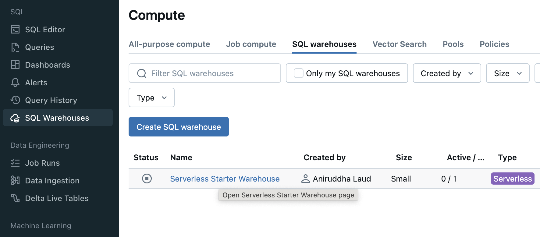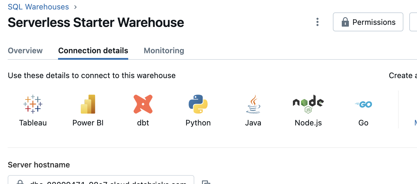 Information needed is the Server Host Name, Http Path and an Api token. To get these go to Databricks and find the warehouse or cluster you want to connect to. For warehouses Go to SQL Warehouses and select the one you are going to connect to: