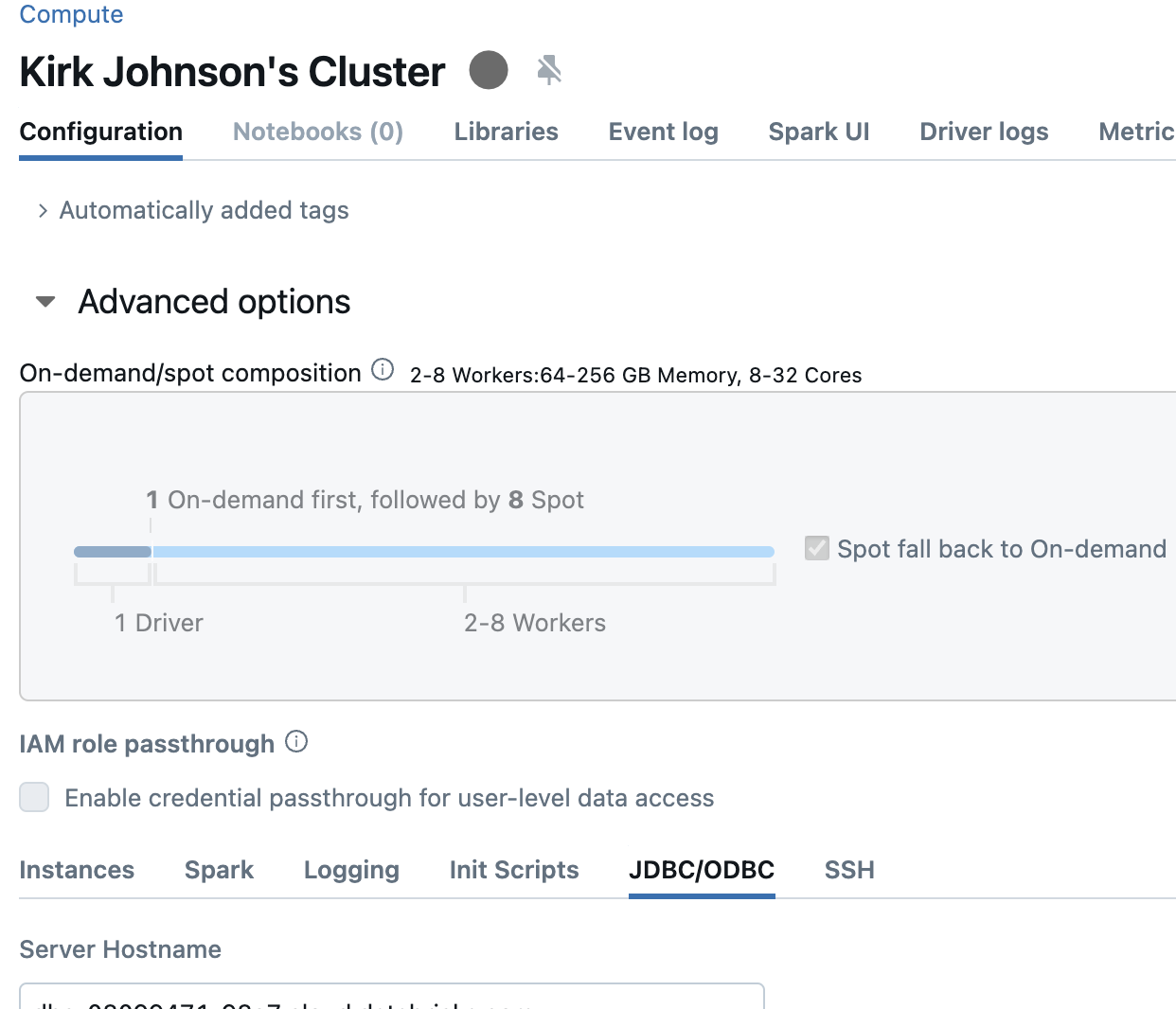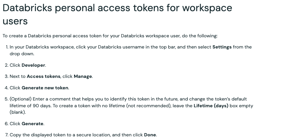Click next and then enter the required Databricks information. There are hover overs with links to documentation on where to find this information for Databricks