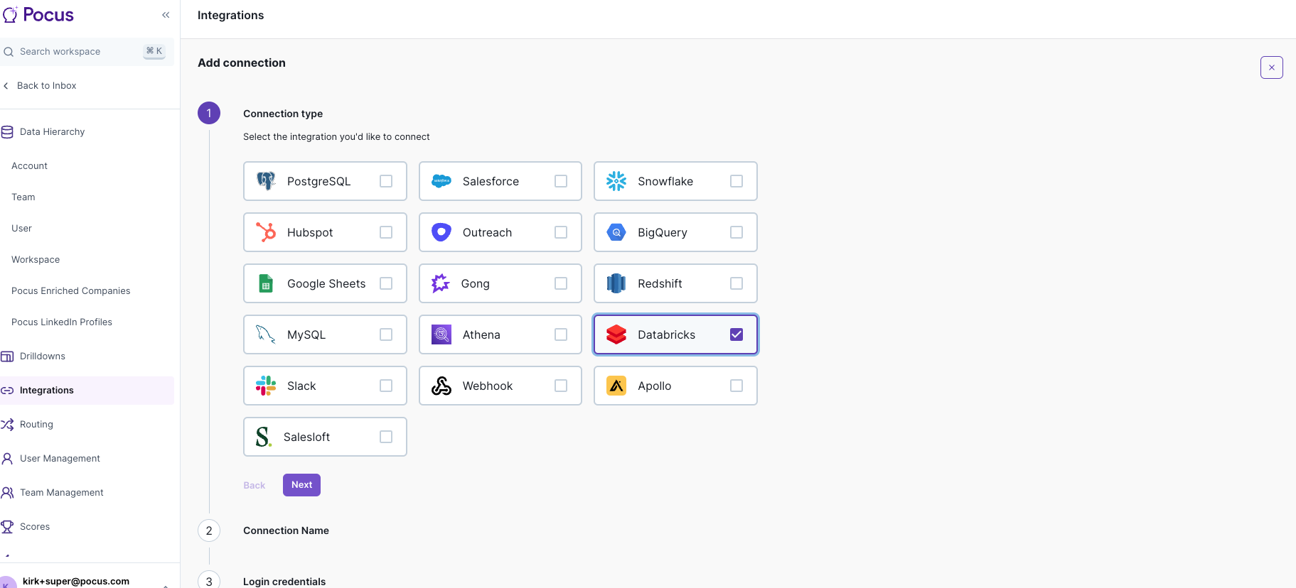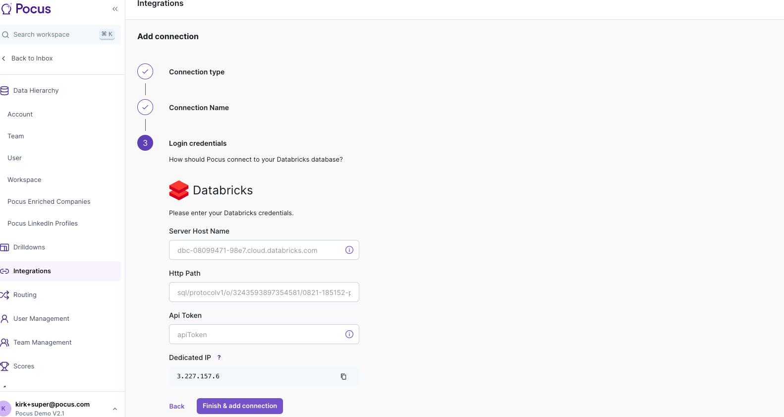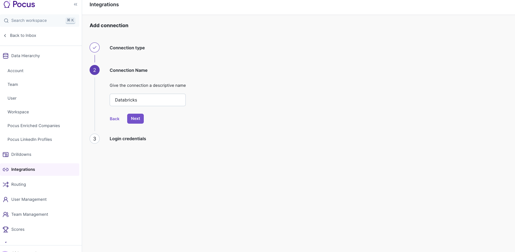 Go to your Workspace Settings -> Integrations -> Create Connection and select Databricks