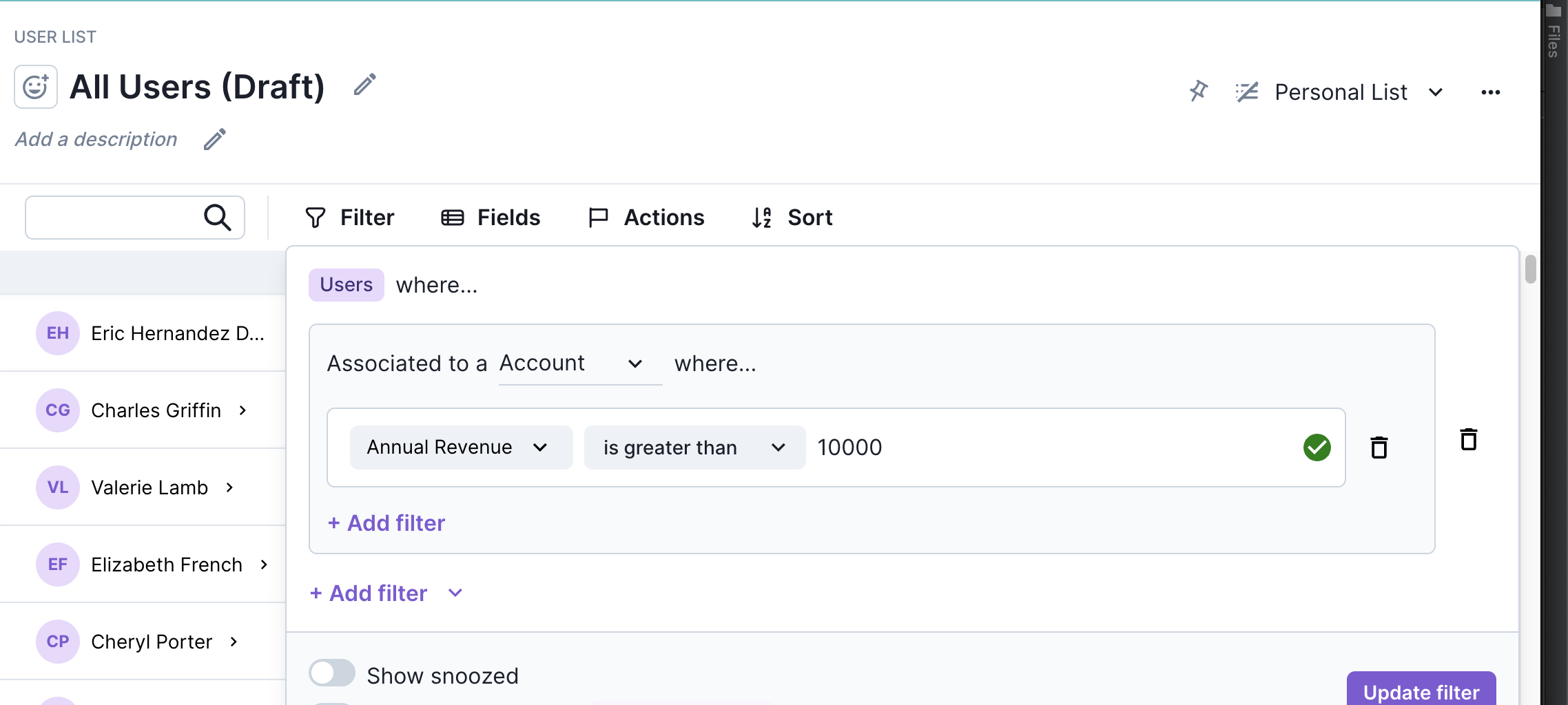 A common use case is wanting to filter on all users that are associated to an account that match certain ARR or activity conditions.