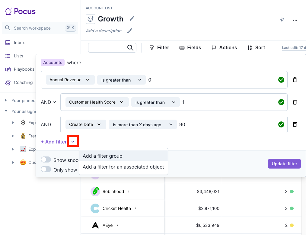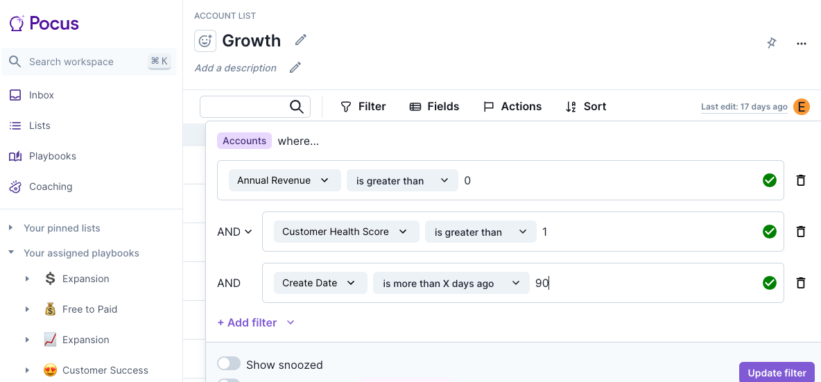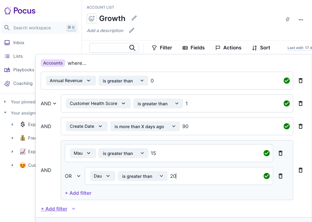 Filters are used throughout Pocus to specify what objects we want surfaced or included. While filters are used in a large variety of Pocus features (playbooks, goals, lists, signals, automations, etc.) their core functionality does not change, so mastering filters is key to getting the most out of Pocus!