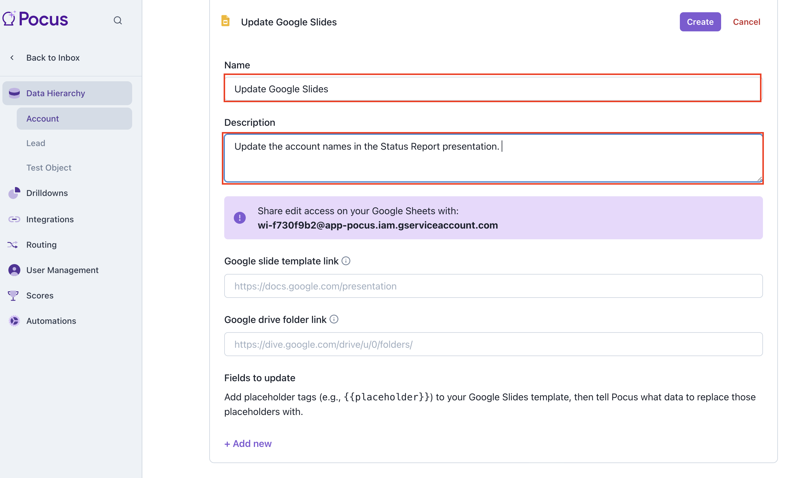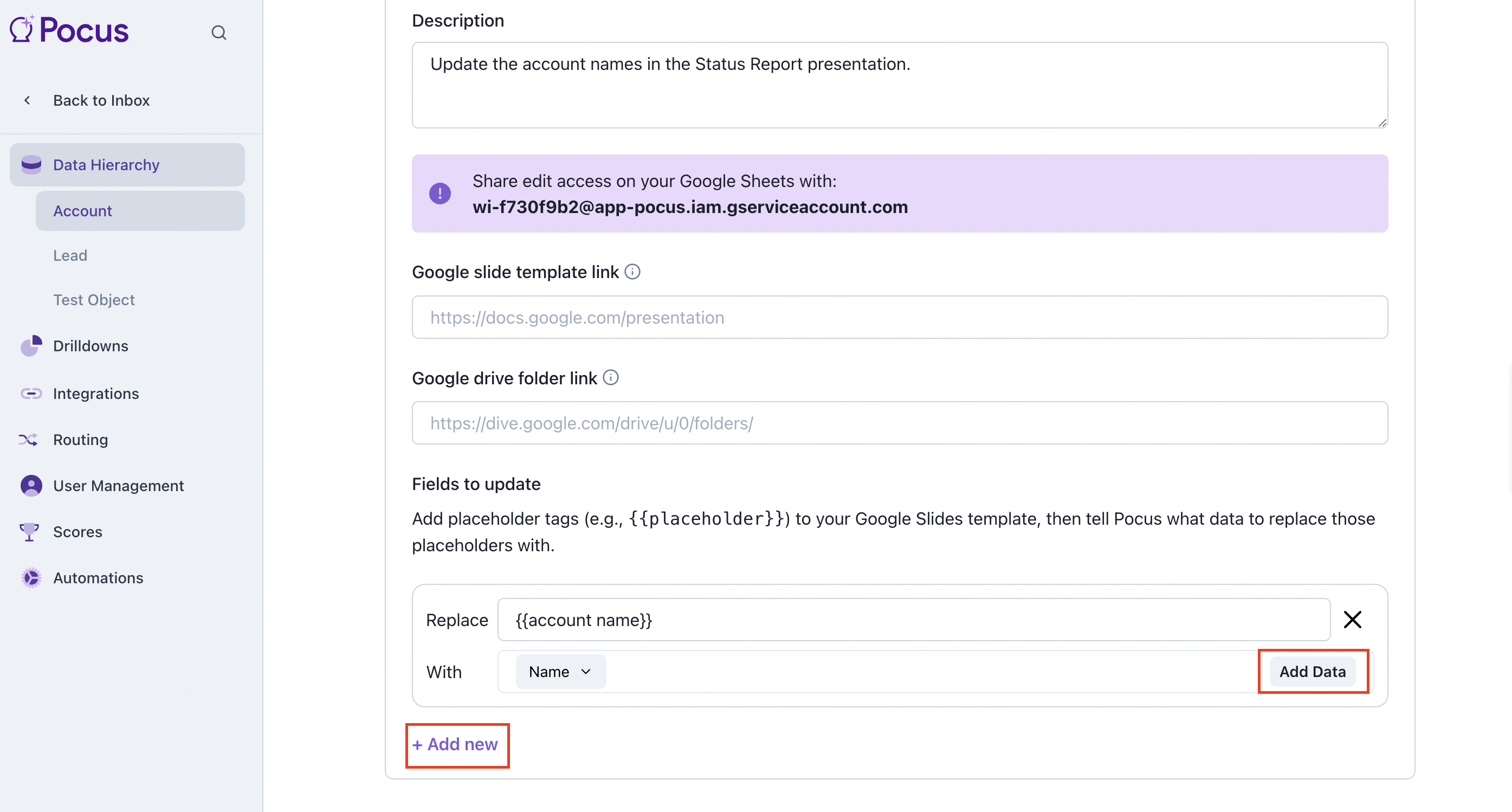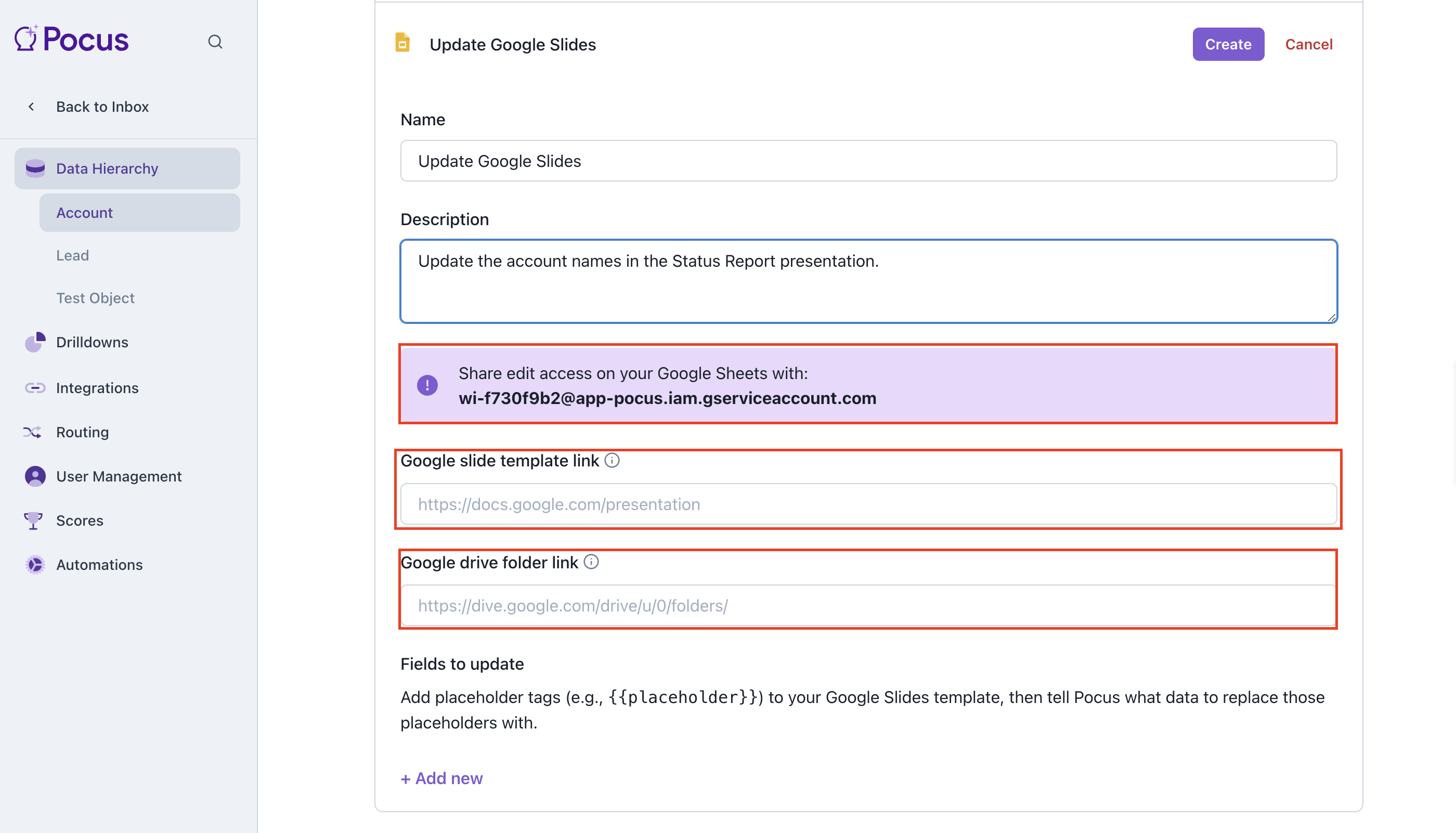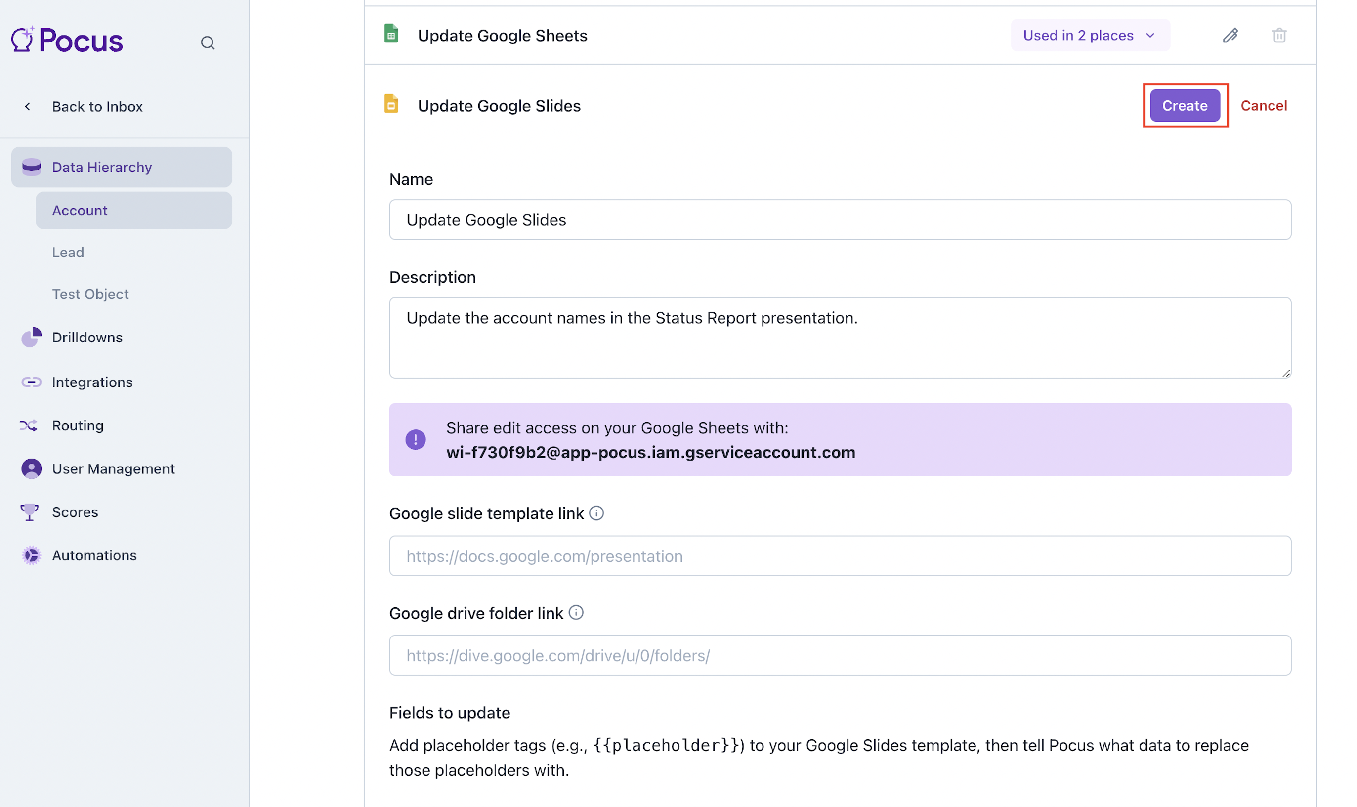 Give edit access to the relevant presentation and Google drive folder with the provided Pocus service account email. See GSuite Integration Article if you haven’t yet configured a service account. Once this is done add the URL of the Google Slide presentation and Google Drive folder to the input fields