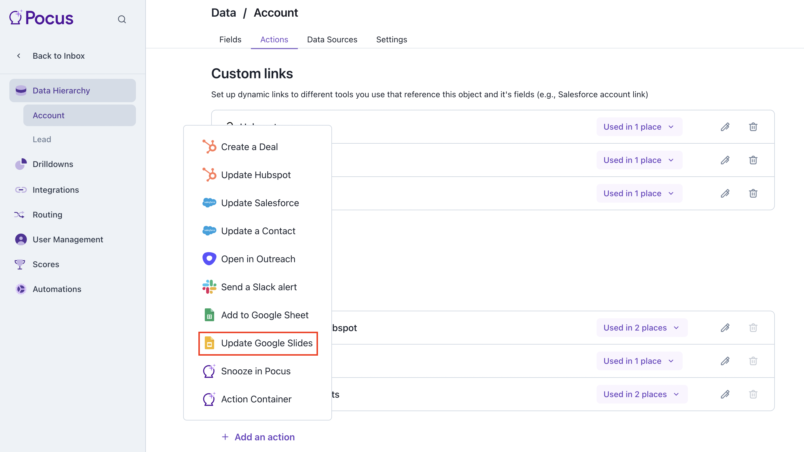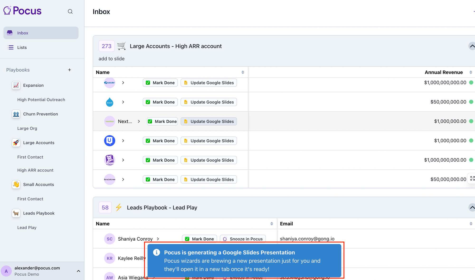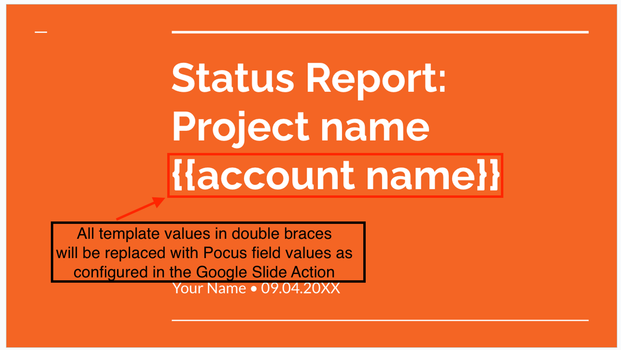 When creating presentations for specific Accounts, Workspaces, or any other item you have synced into your Pocus workspace, the Google Slides Action can be leveraged to streamline the process.