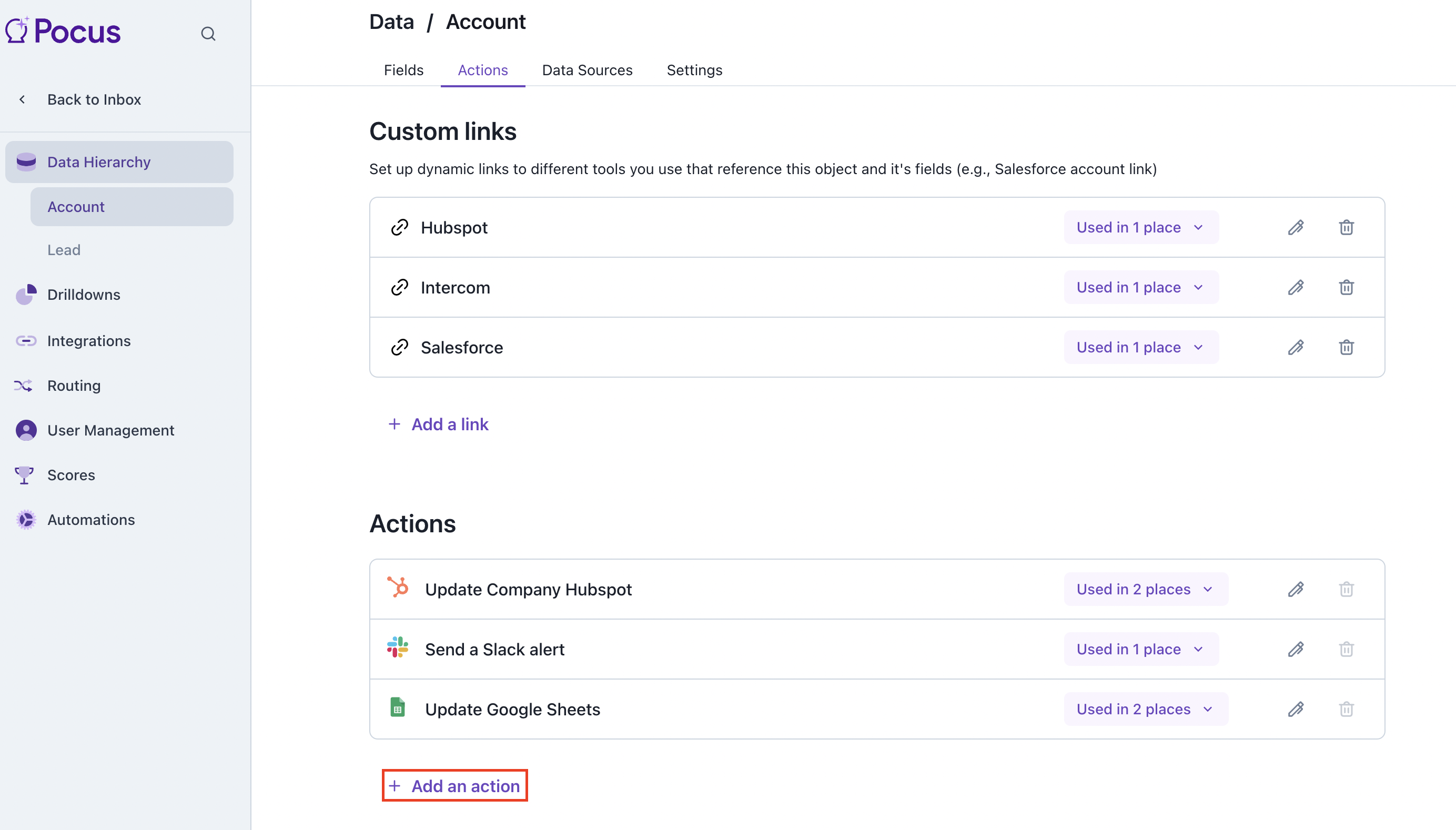 Navigate to the Workspace Settings page and select the item you would like to add your new action to. Once selecting the item, navigate to the "Actions" tab and at the bottom of the resulting page click Add an action