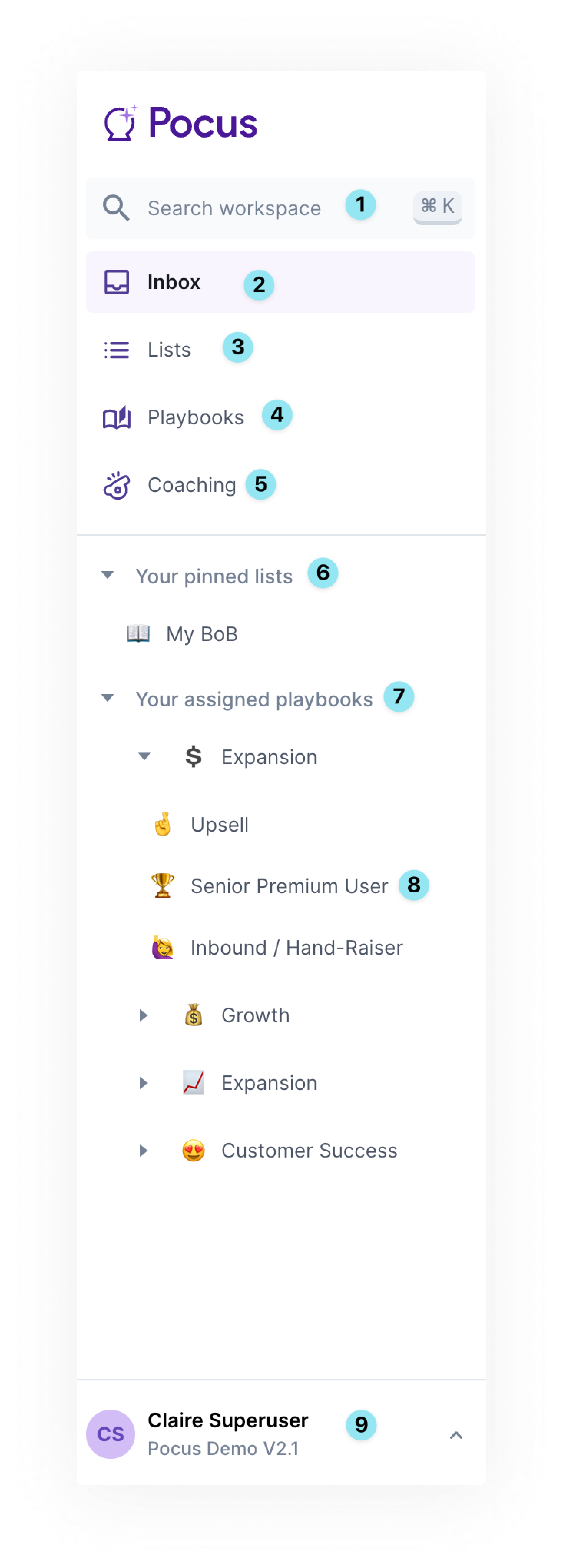 When you first log into Pocus, you'll land in your Inbox. This is just the launchpad for you to start your day. Learn more about all the other functionality of your Pocus workspace and how to get there.