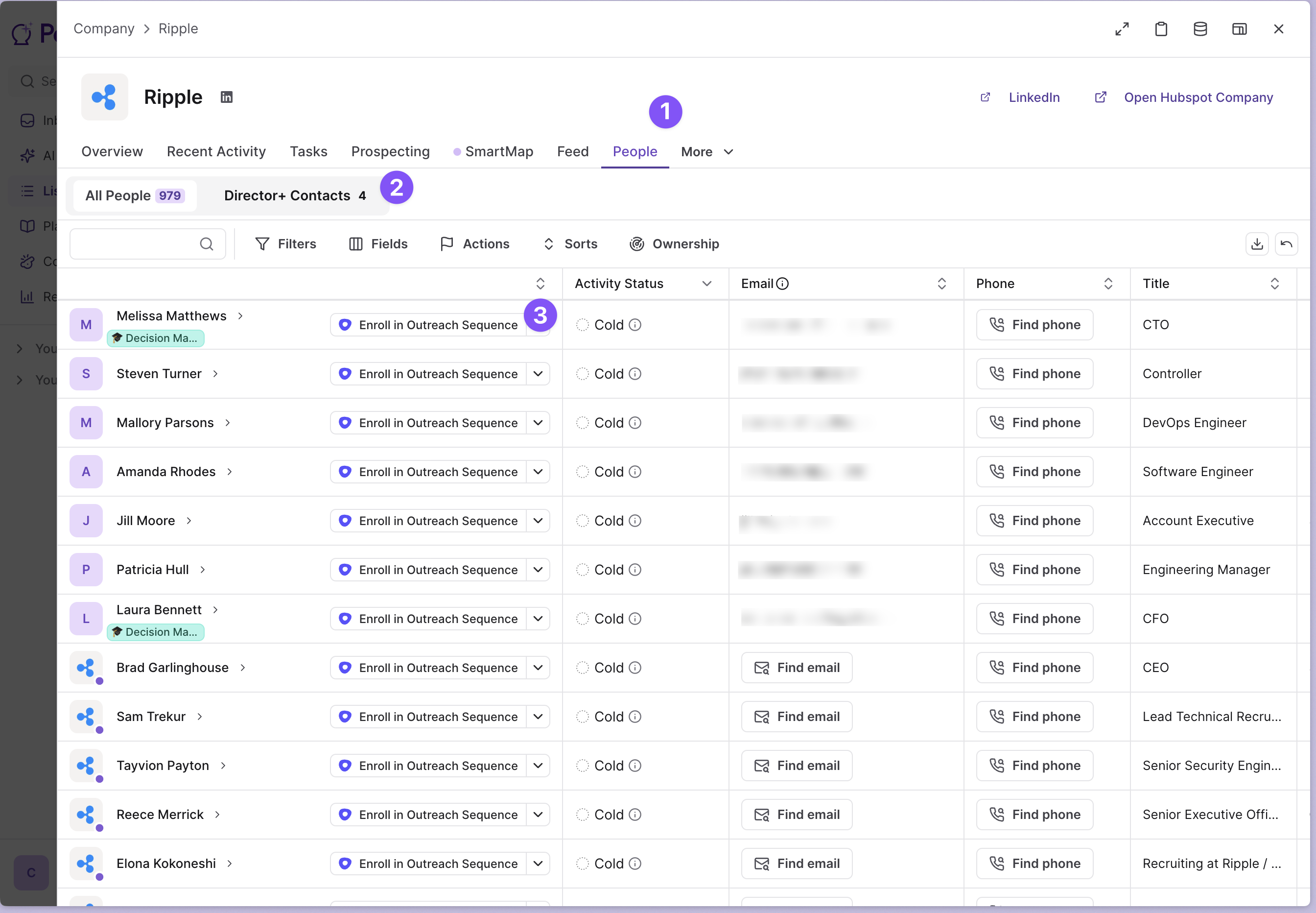 The People Tab (1️⃣) transforms how you engage with prospects by offering a zoomed-in perspective on all contacts associated with a specific company account. Whether you're nurturing existing relationships or identifying new opportunities, this feature puts comprehensive contact intelligence at your fingertips.