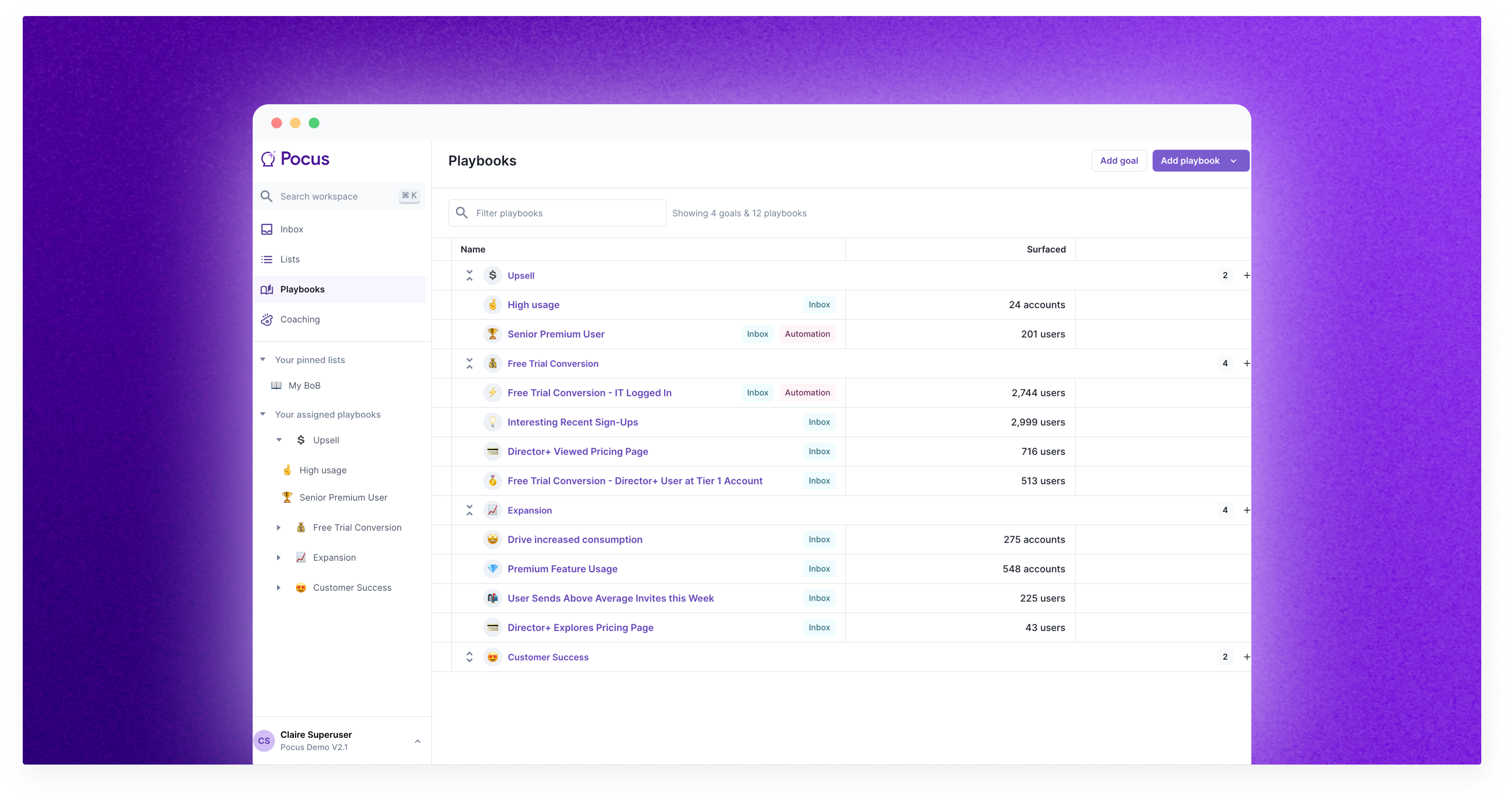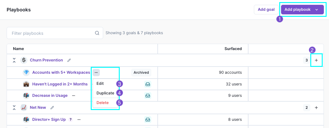 Click the ➕ icon next to a Goal to quickly create a new Playbook under a particular Goal. To the left of the icon, you can also see how many Playbooks you’ve already built for the Goal.