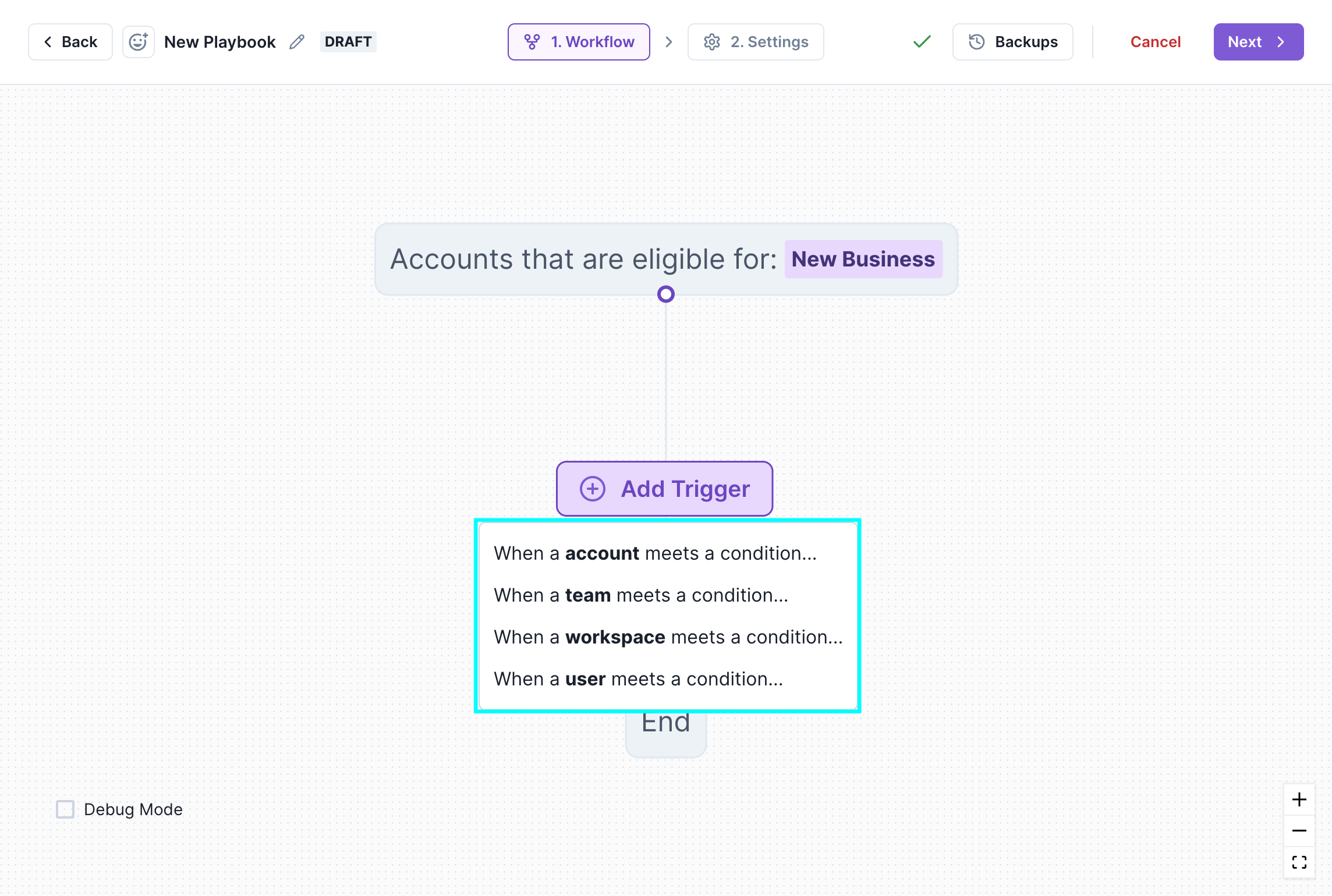 The first step to creating a Playbook is deciding what object you want to run the Playbook on. With Pocus’ flexible data model, you can build playbooks on associated objects, so the important thing to consider is where reps should be taking action.