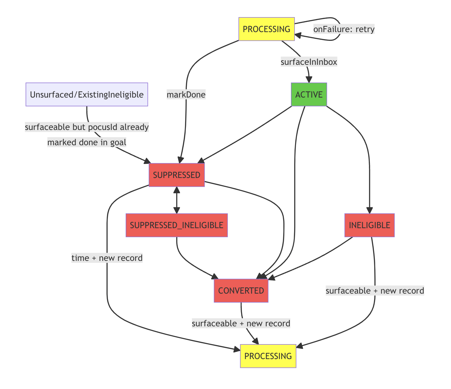 The below diagram describes the different possible states of an inbox entry and how an inbox entry transitions between states.