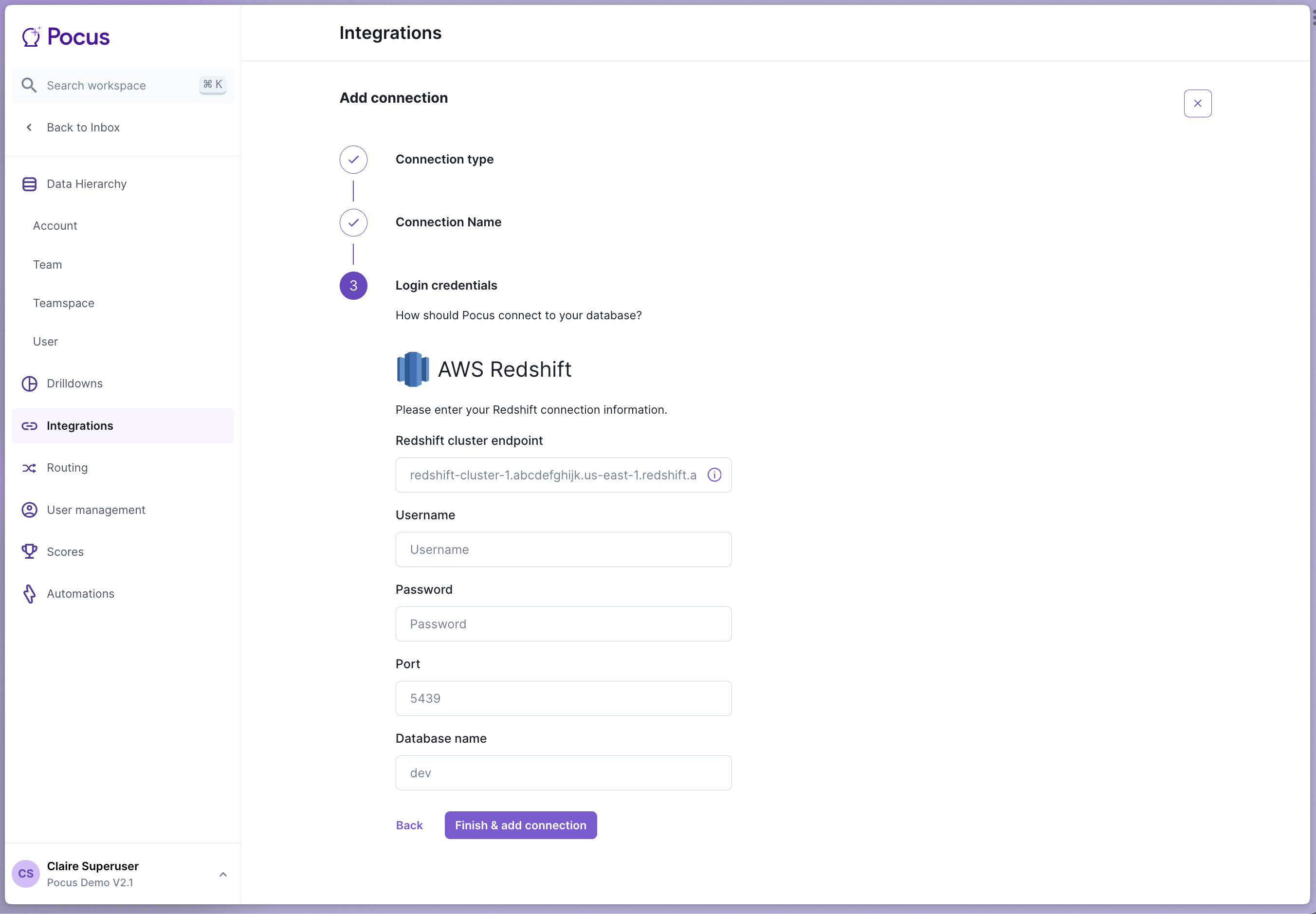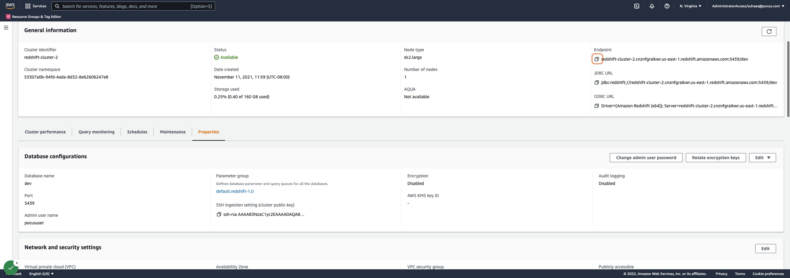 Endpoint,Database name, andPortPocus needs these values to connect to your Redshift cluster.