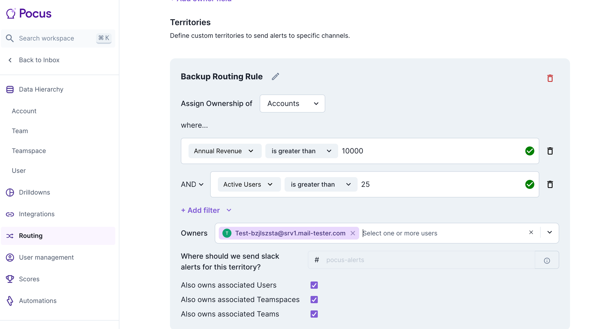 The example territory above will result in all Accounts with Annual Revenue > $10,000 AND Active Users > 25 being routed to our test email user. Any Users, Teamspaces, or Teams associated with those matching Accounts will also be routed to our test email. If any of these Accounts already have an owner email, they will also be routed to that owner. To avoid this overlap, add the condition that ourOwner Email field is empty.