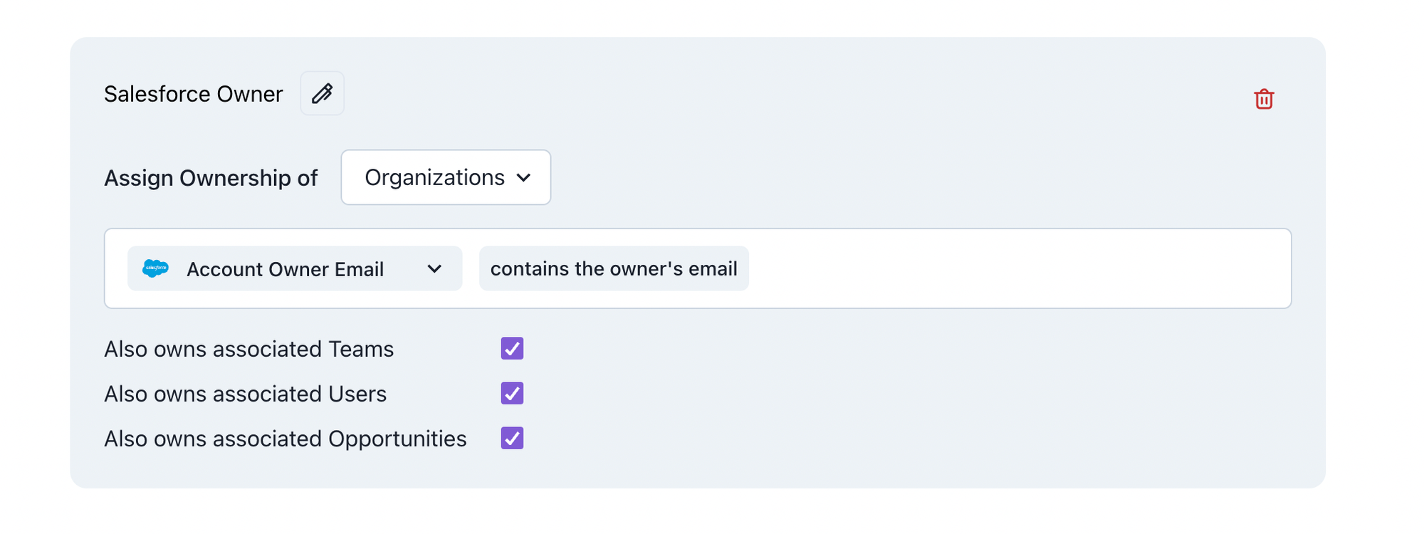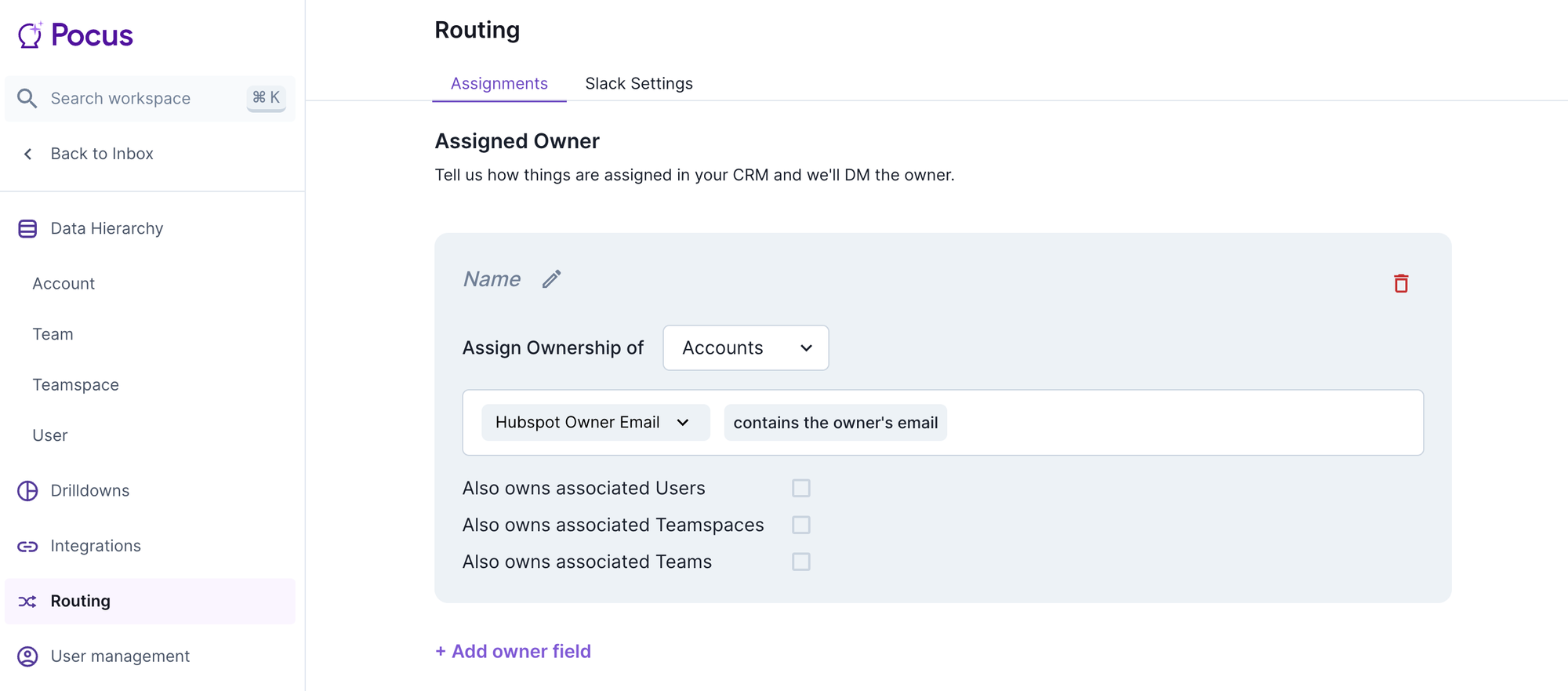 When there is a field in a CRM that has the owner's email address, you can set it here to match the email address of the Pocus end-user. Note it must be an email address field, not an id or name. Check the associated object boxes to have the owner also own the associated users, etc.
