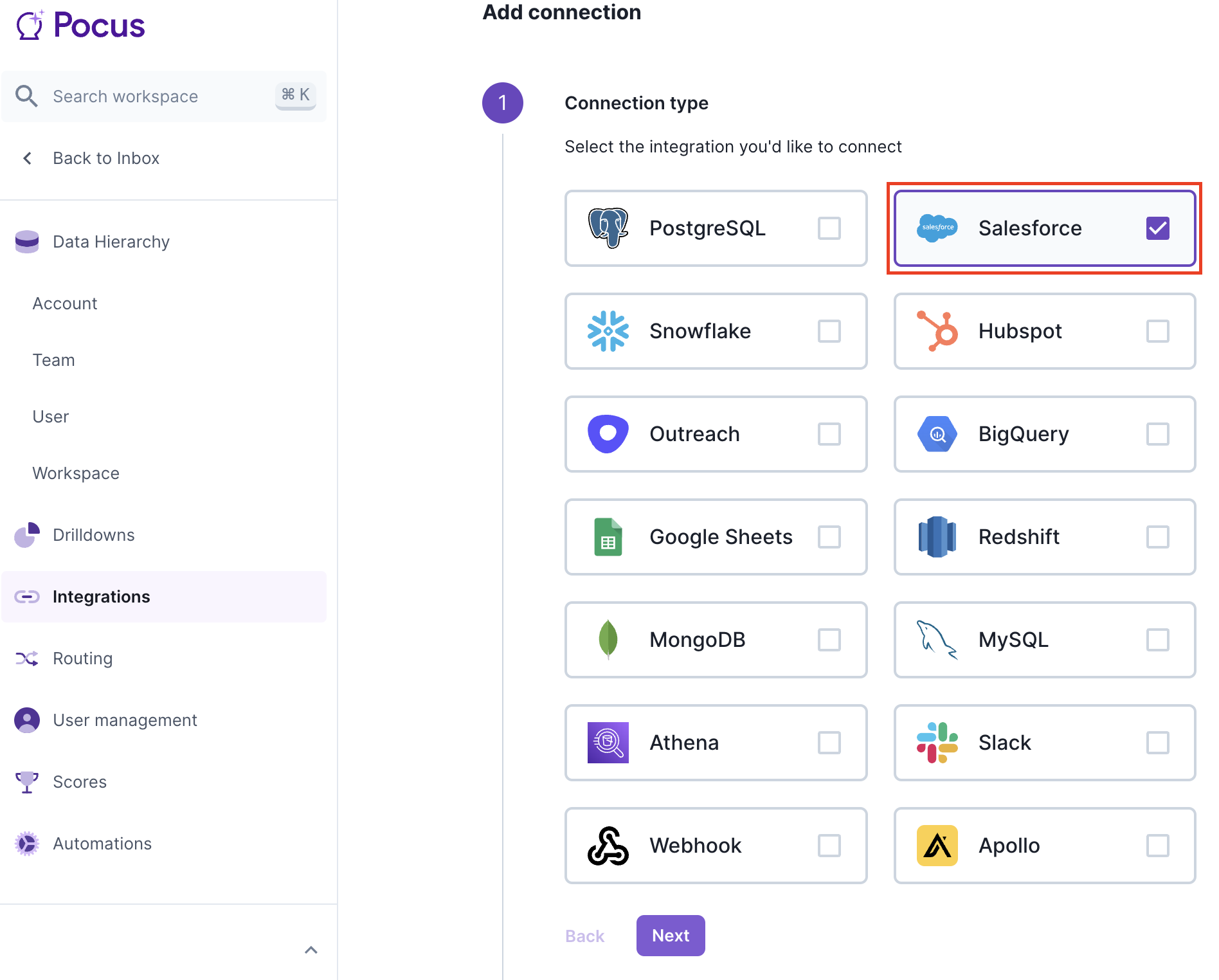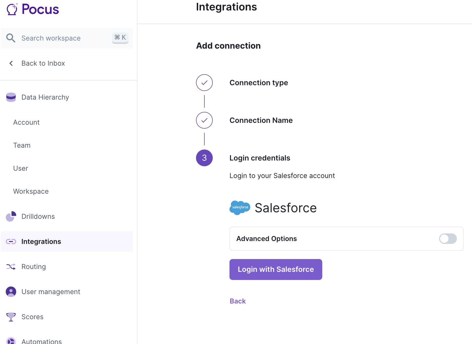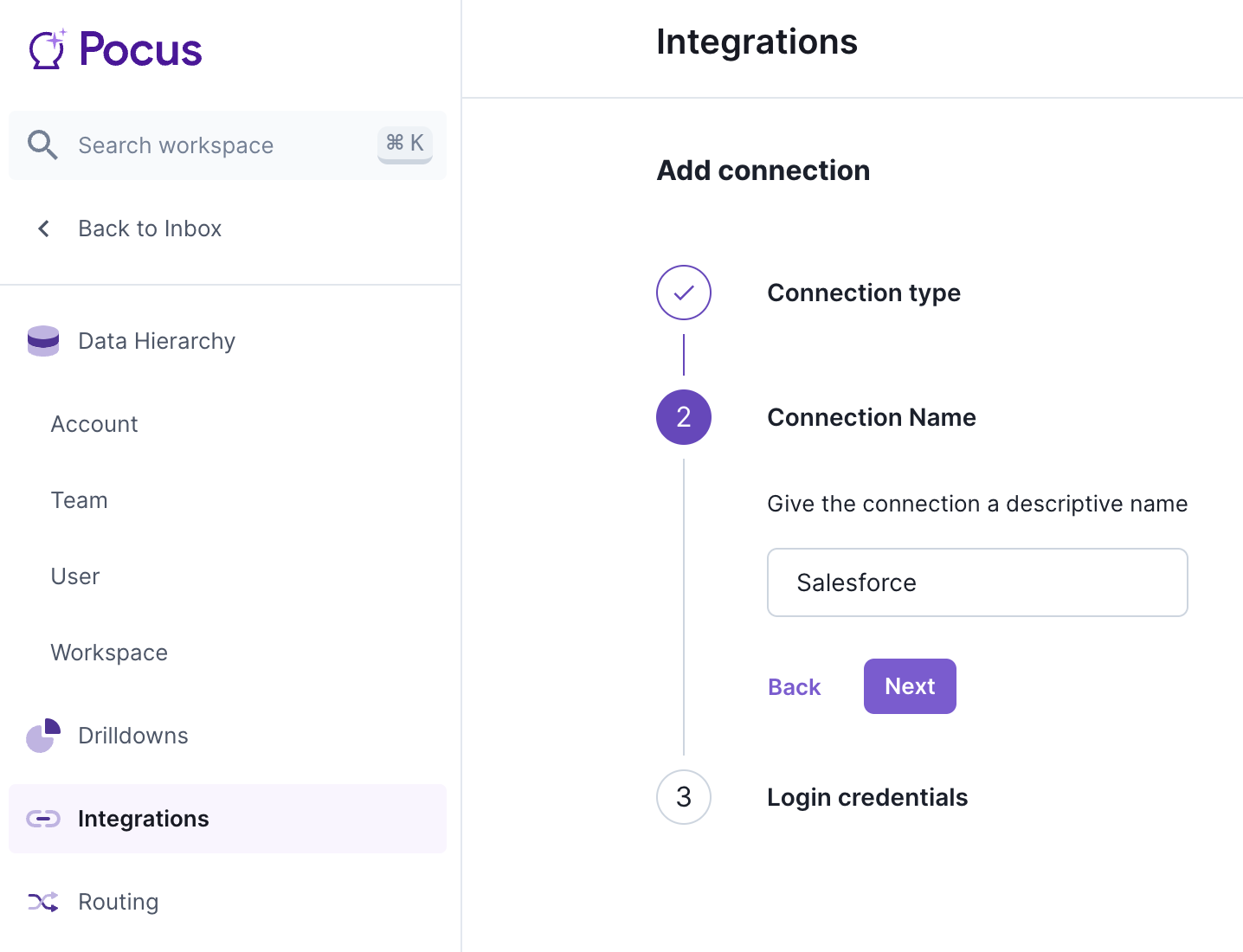 Once the integration user is created, follow the below steps to create the integration in Pocus with oAuth.
