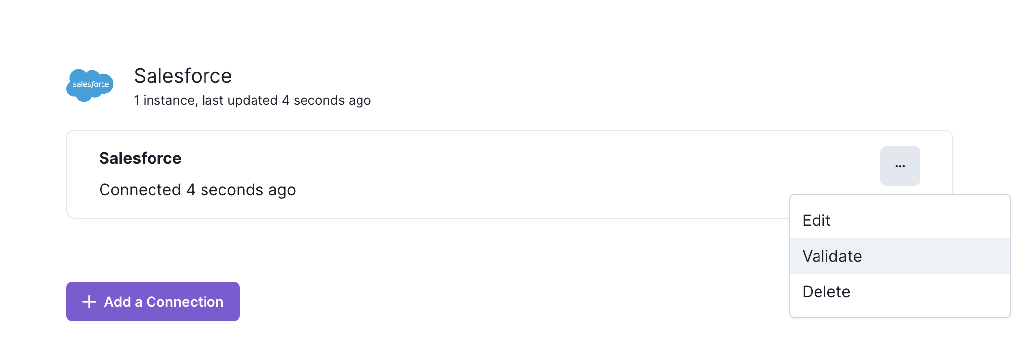 - Navigate to the Pocus Integrations Page and press the menu button next to the newly created Salesforce connection.