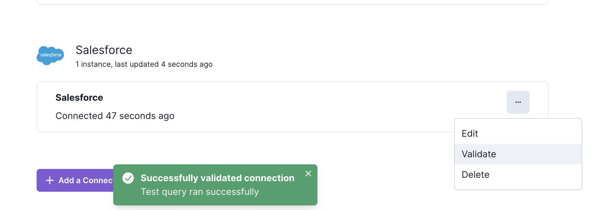 - If the connection with Salesforce is set up correctly, you will see a green notification at the bottom of your screen. If an error appears, please contact our team for assistance.