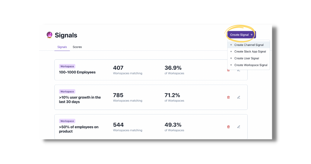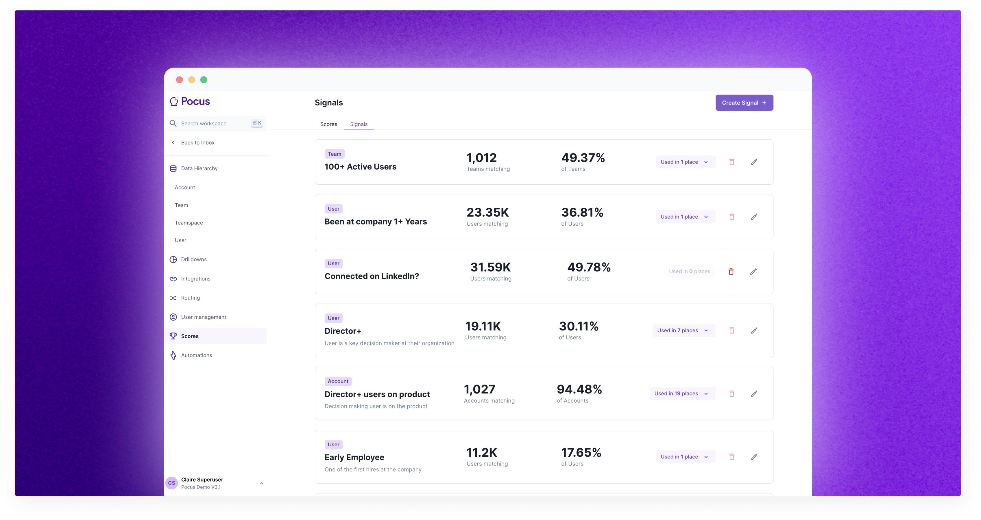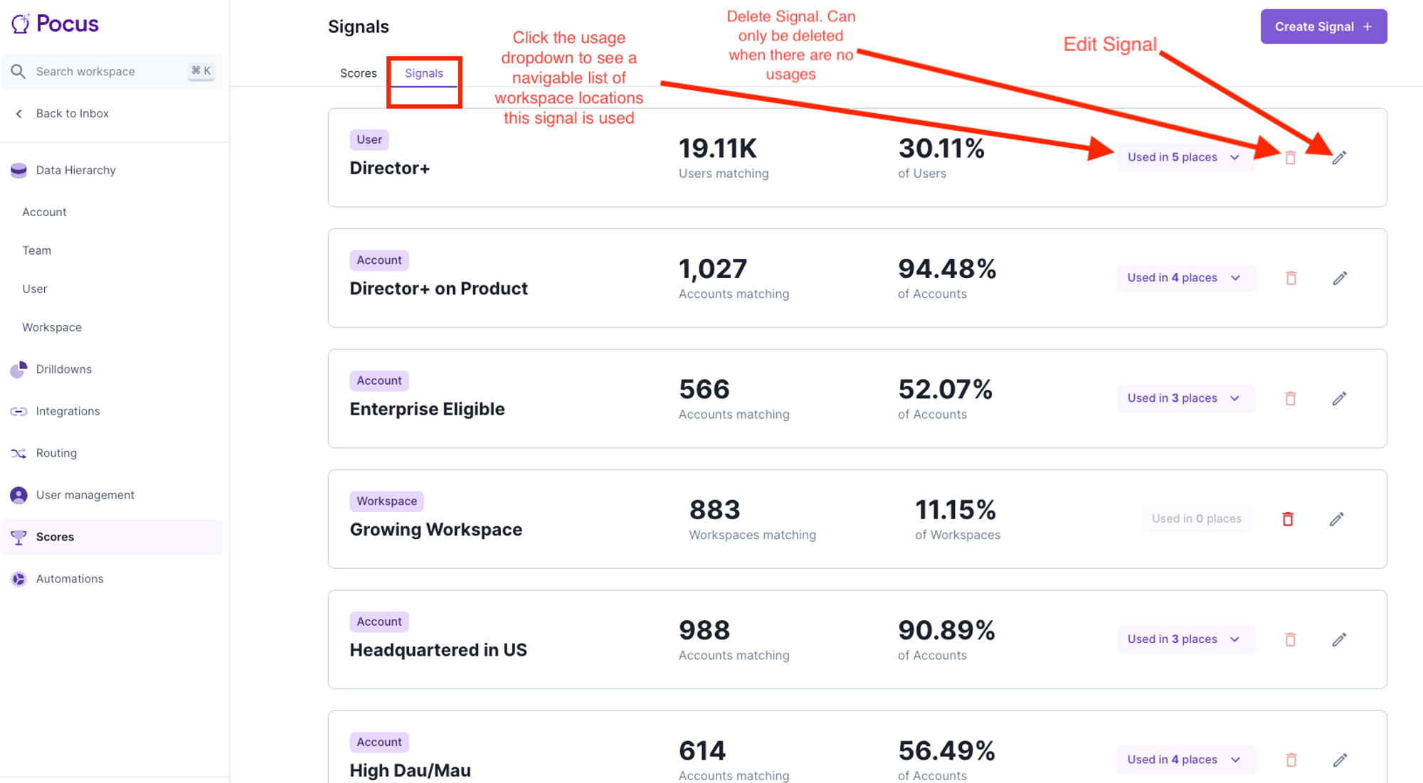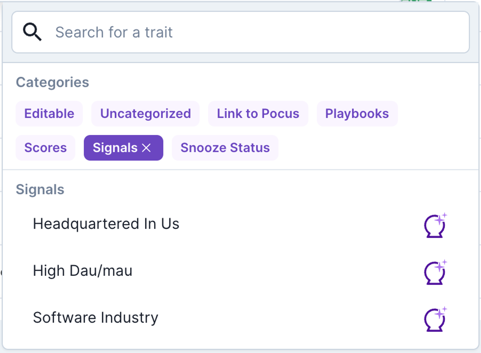 Signals are positive or negative attributes about your accounts, users, or any custom object. They are used to inform Scores and can be leveraged in filters throughout Pocus or included in lists like any other field.