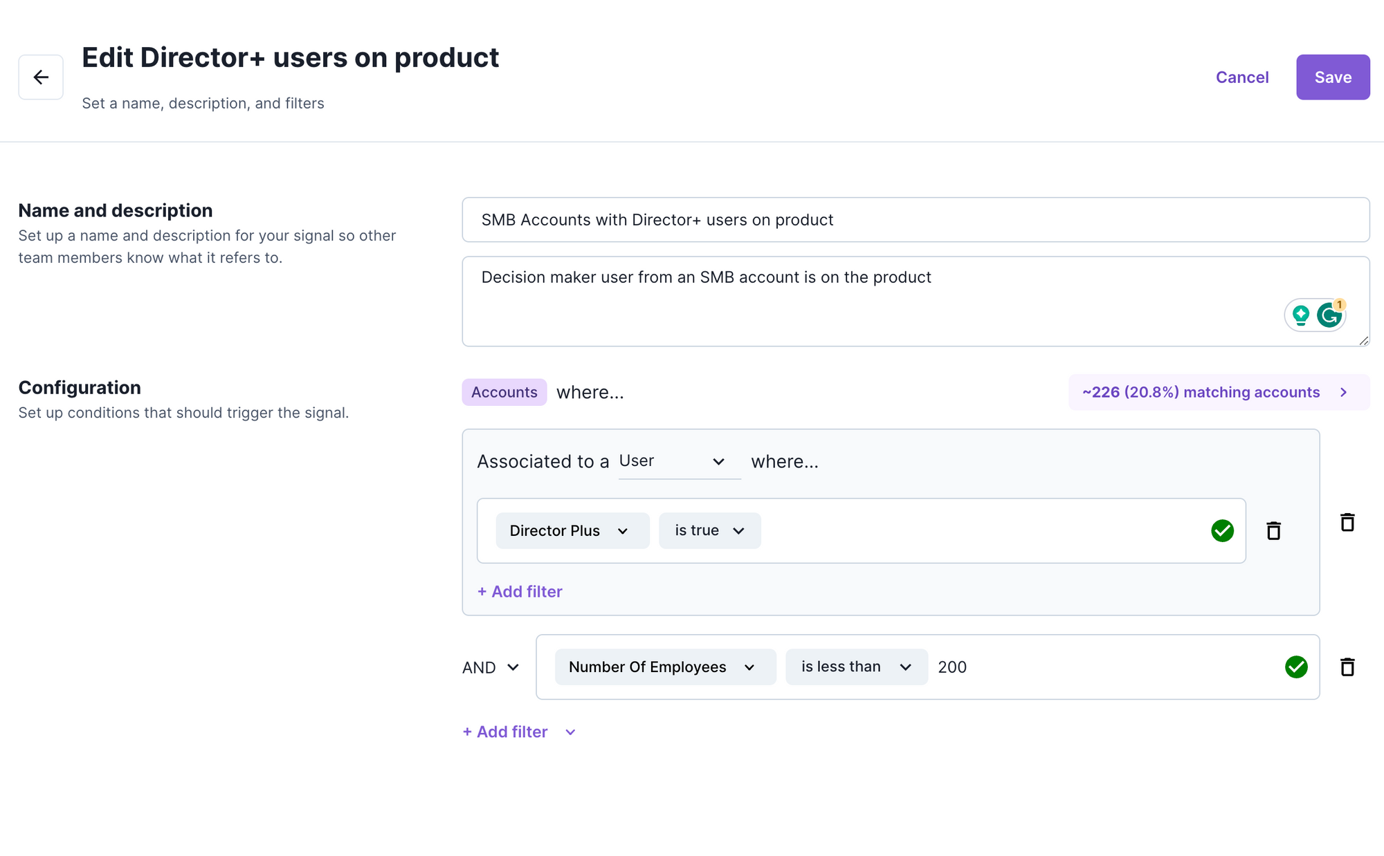 The example above creates a Signal field available on accounts. It will be true for any accounts that have less than 200 employees AND have at least 1 user associated with them with a Director + title.
