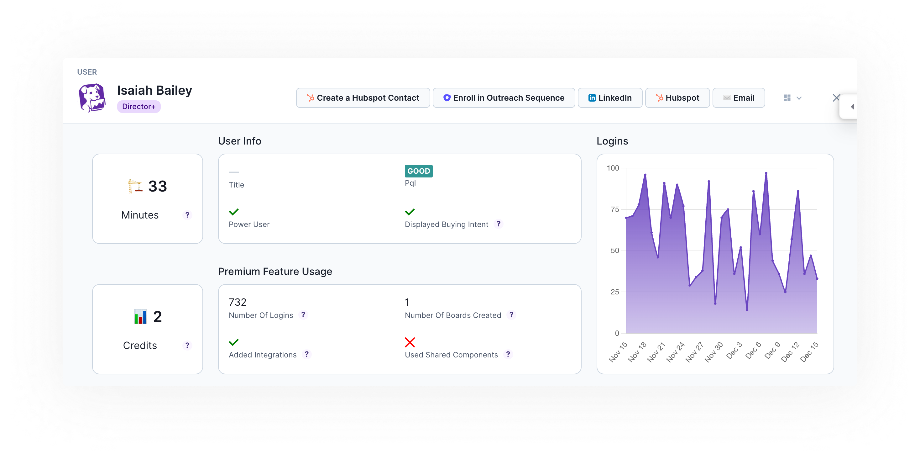 - Director+: Use a “contains” filter on a user role field to include all the high-value roles to easily flag decision makers on your product in your Goals and Playbooks