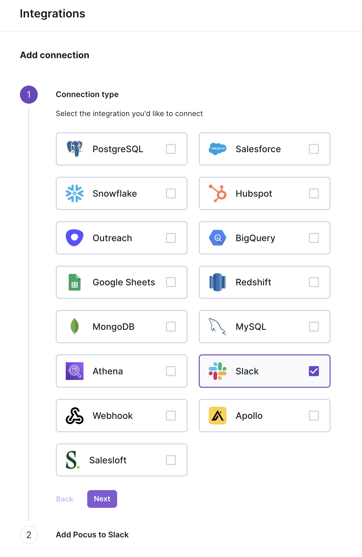 - Navigate to the Pocus Integrations Page and select Add a Connection