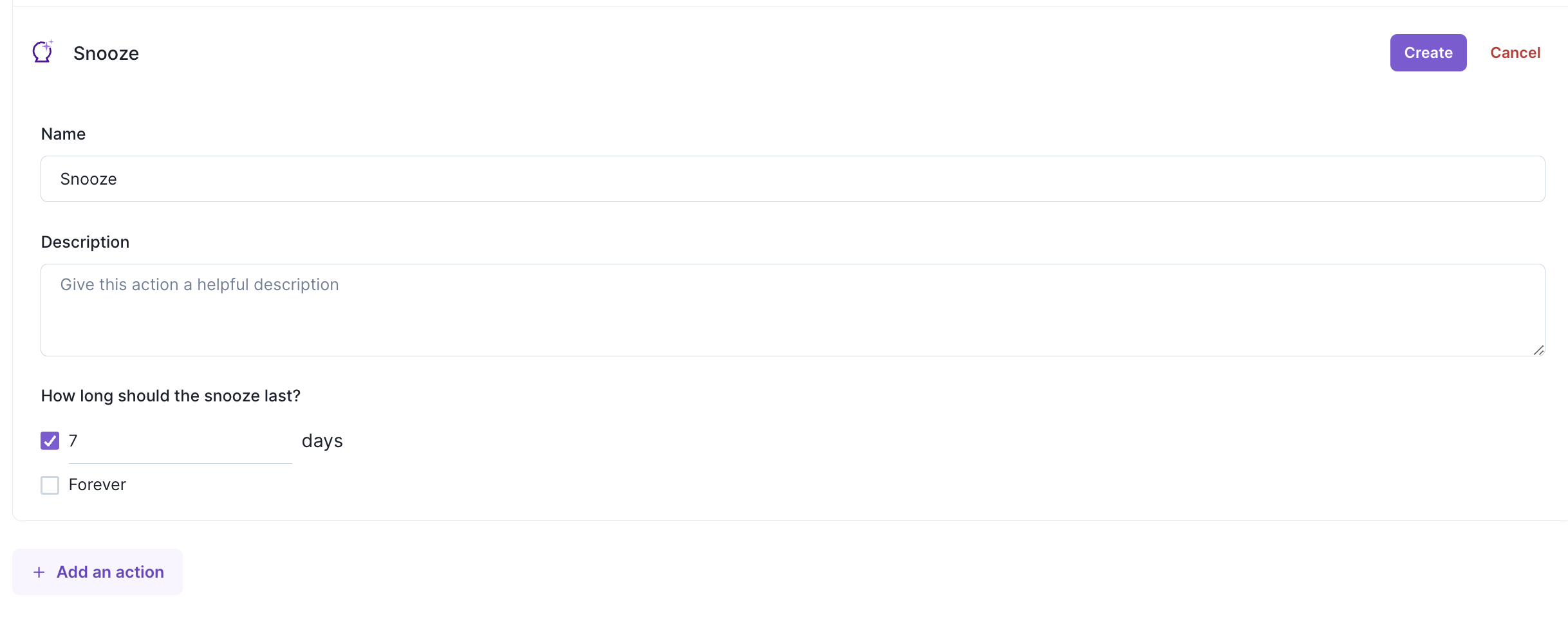 - Name your Snooze action. It’s helpful to include the duration in the name since that won’t be visible outside of the configuration.