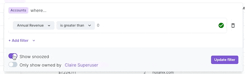 - You’re splitting your book or working closely with an AE, SDR and know they are actioning a user. Use a Snooze so that the hiding only impacts you.
