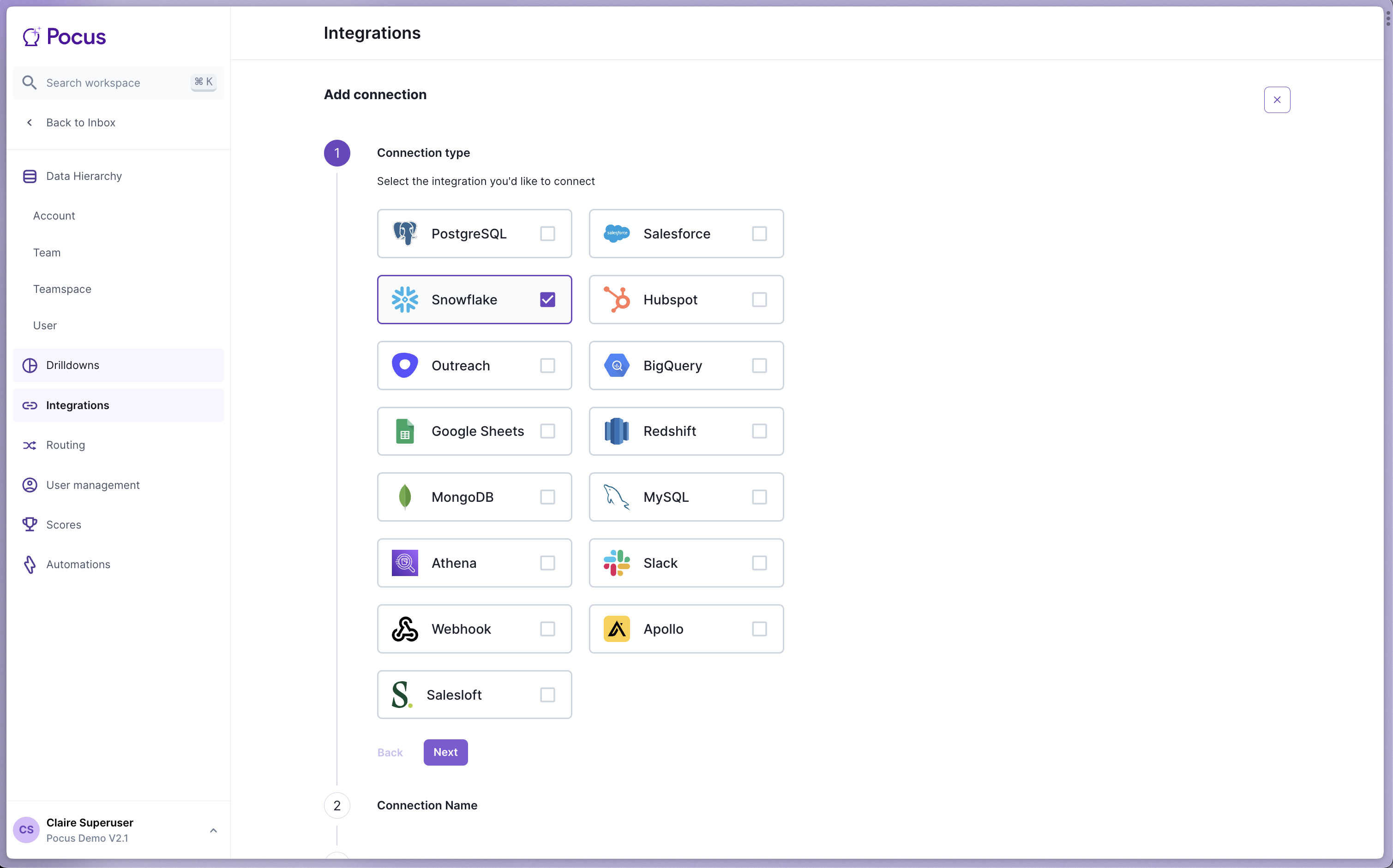 - Navigate to the Pocus Integrations Page and press Add a Connection
