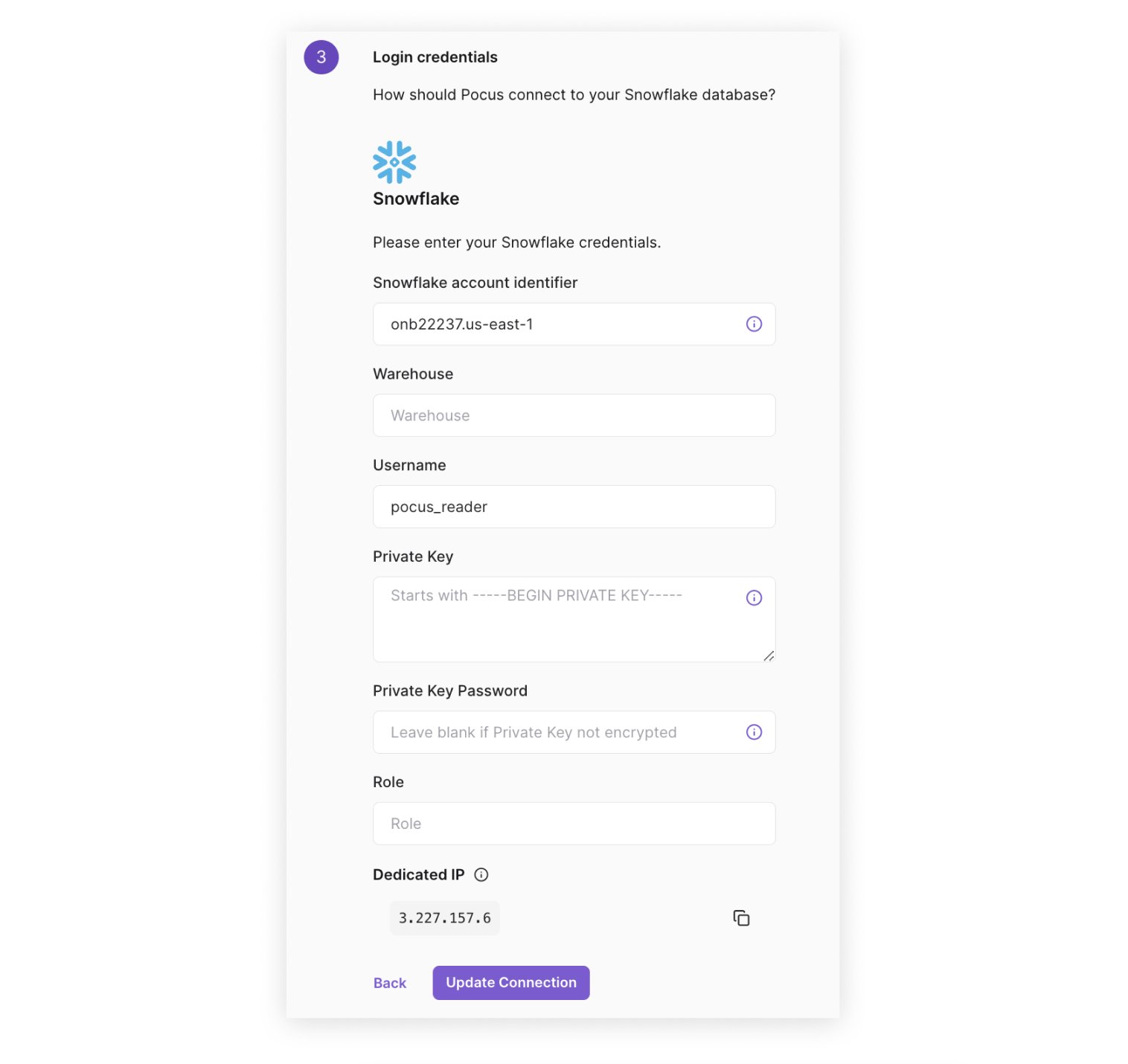 - Edit the existing Snowflake integration on the Pocus integration page with the private key you set.
