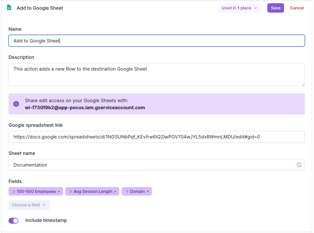 - Once populating these values, select the fields you would like to be pushed to your Google Sheet. If you would like to include the date and time that your values were pushed to your Google Sheet, toggle on the "Include timestamp" switch at the bottom of the action. This setting will result in the activation timestamp being populated as the final column. You can also include the “pocus ID” for each item the action is invoked on. The Pocus ID is a unique identifier for every object record in Pocus so can be used as a new “key” for each row in your destination Google Sheet.