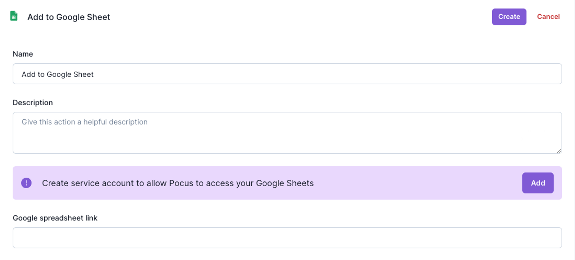 Add to Google Sheetfrom the+ Add an actionmenu - If you haven’t already done so, you’ll be prompted to create a Google Service account. Click the purple