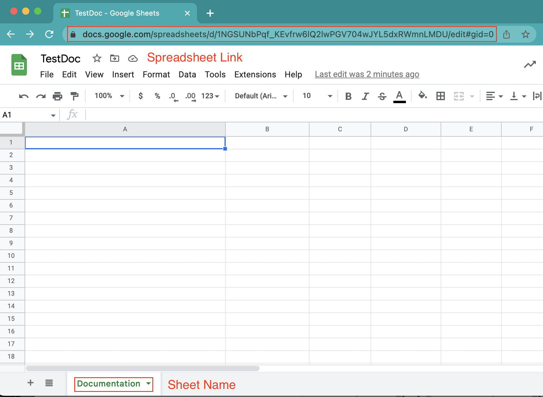 - Now add the Spreadsheet link and the Sheet name, these can be found on your Google sheets in the areas highlighted below