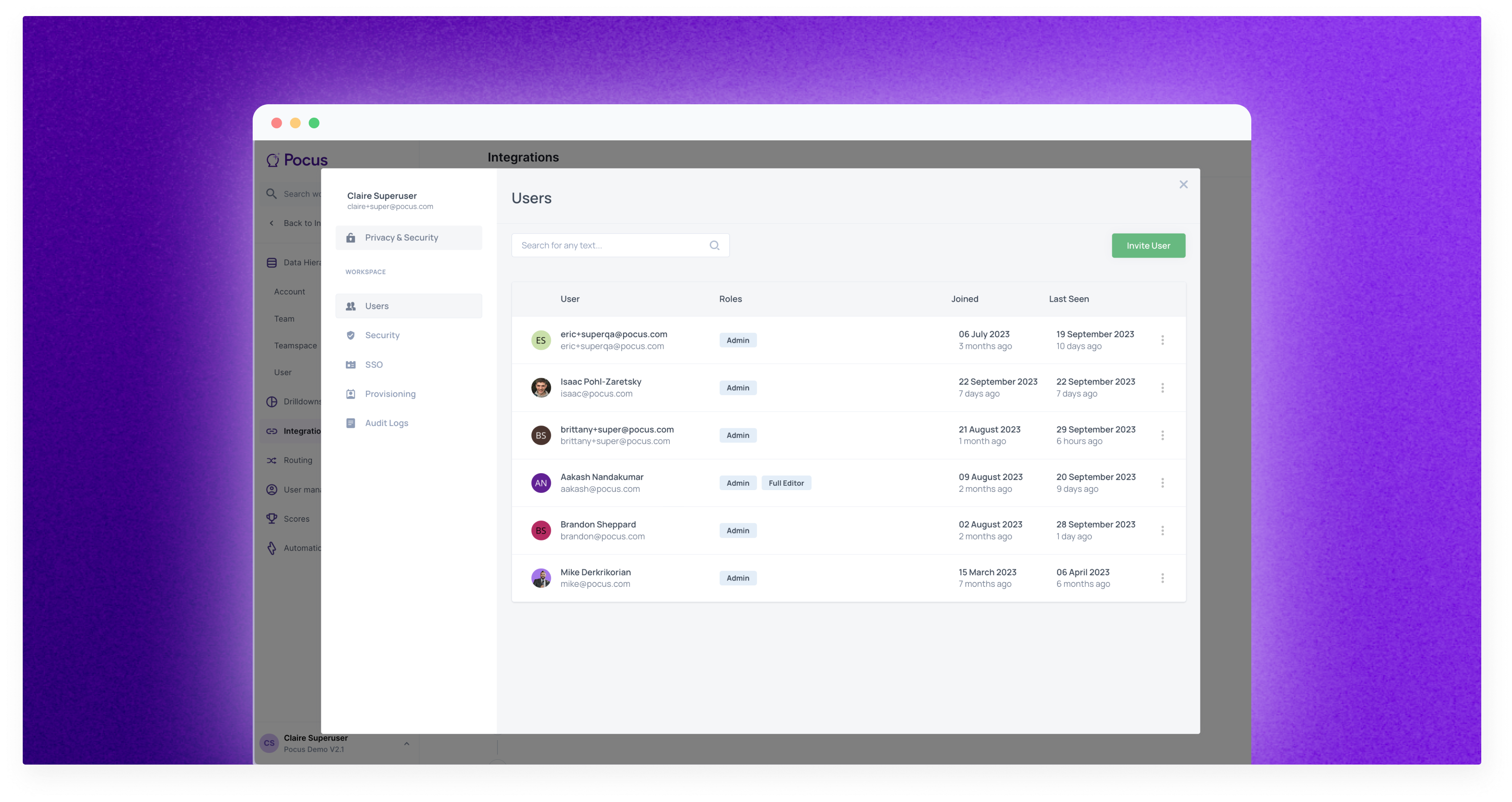 Admins have the ability to invite, edit, and remove user permissions from Pocus in the User Management section of Workspace Settings. This section also contains additional security features around SSO, Audit Logs, and Security settings.