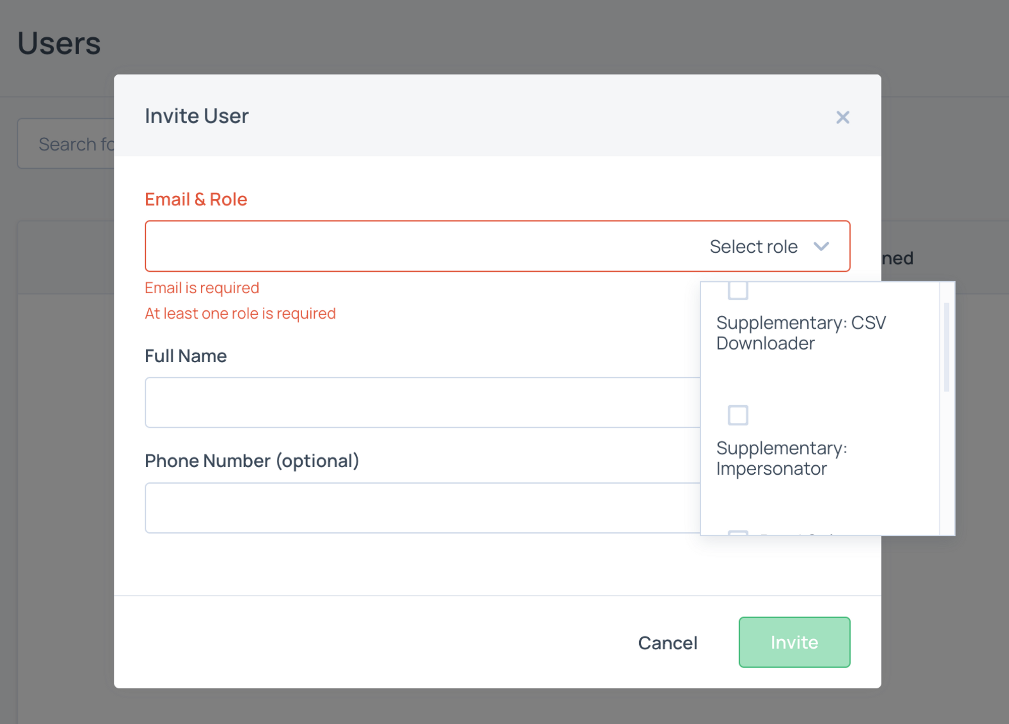 - To invite a new user, click on the green Invite User button. From here you can grant the new user different roles and supplementary permissions. Only Admins have the ability to invite new users.