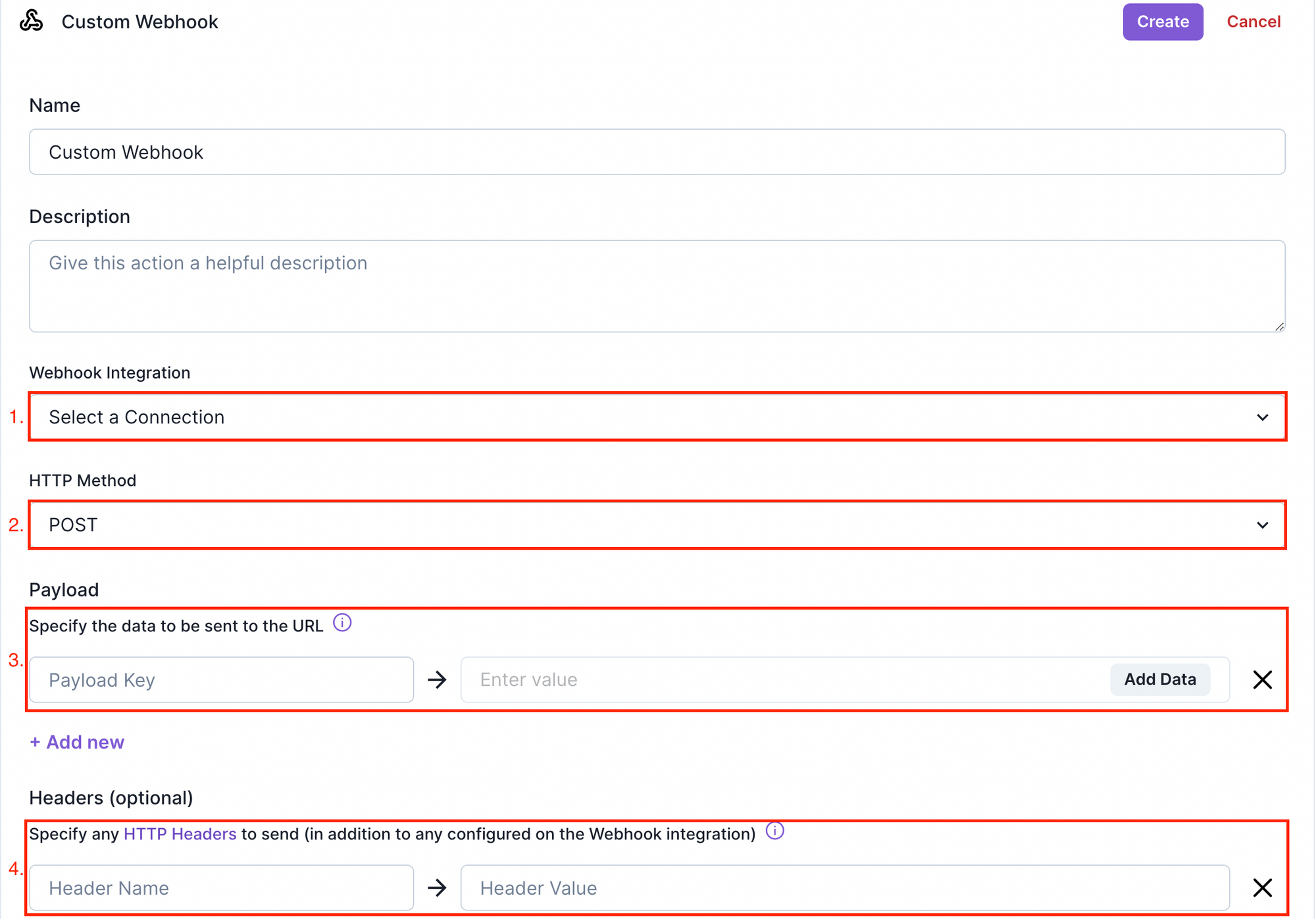 1️⃣ Select the Webhook Integration that this action will target from the integration configured above.