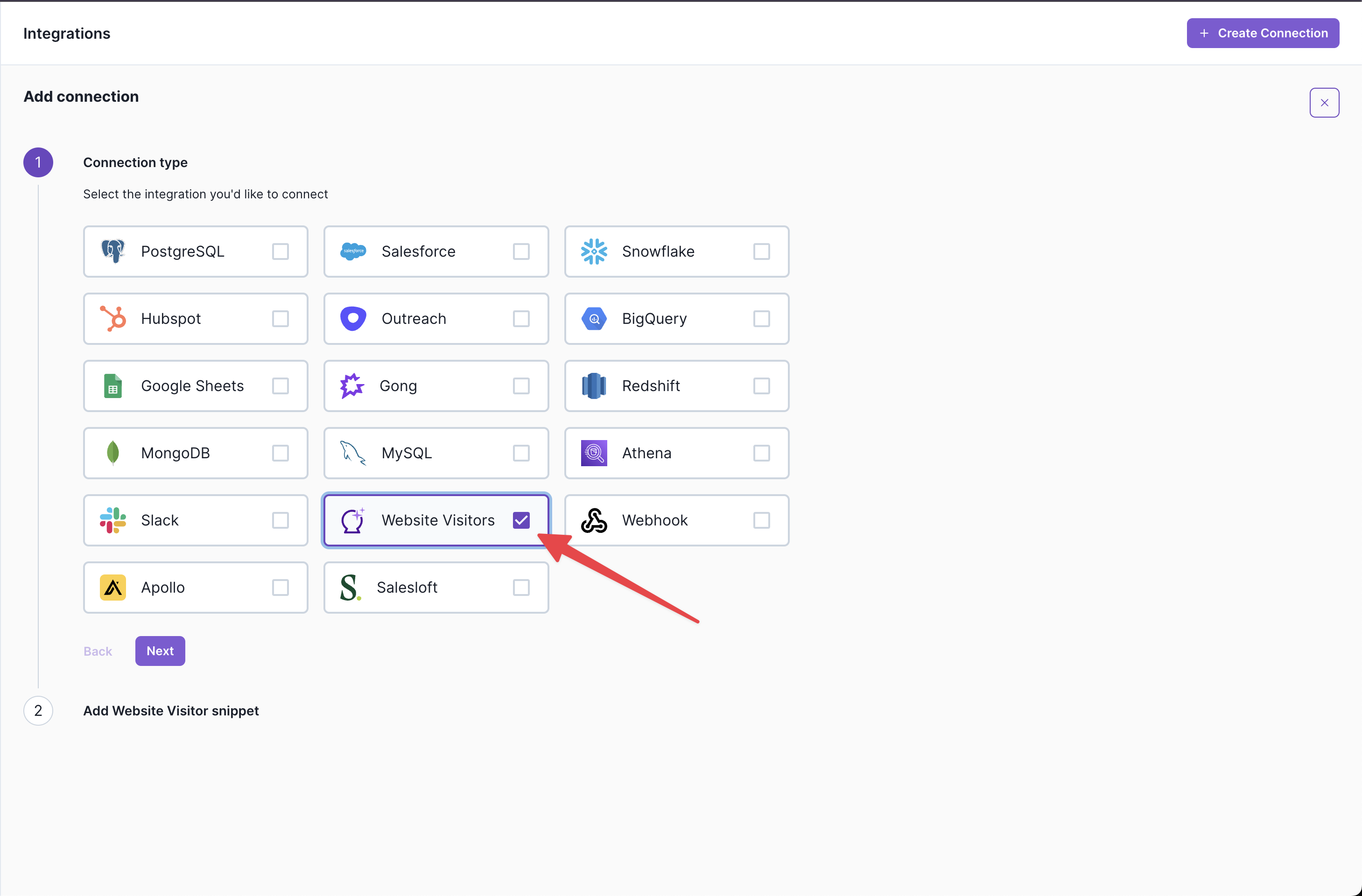 Select Website Visitors: Press the "Website Visitors" connection button and then click "Next".
